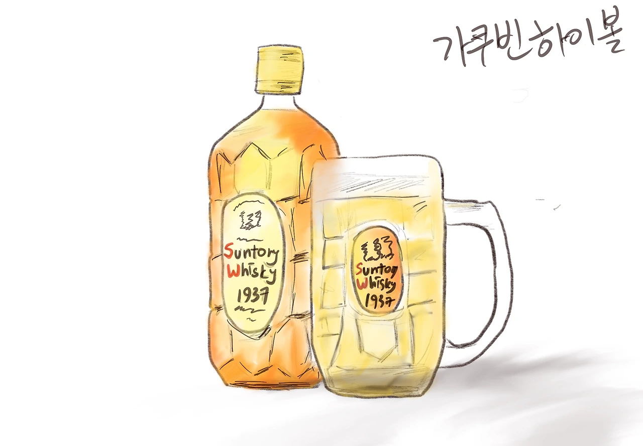 하이볼을 주문하면 거북이 등껍질처럼 갈라진 모양의 잔에 시원한 음료가 나온다. 이름은 산토리 가쿠빈 하이볼이다. 일본어 ‘가쿠빈’ 은 각이 진 병이라는 뜻으로, 산토리사의 네모난 병에 담긴 ‘산토리 위스키’를 뜻한다. 그 위스키로 만든 거라 위스키 하이볼이라는 말 대신 ‘가쿠빈 하이볼’ 일본에서는 줄여서 ‘가쿠하이’라고 부른다. 처음 하이볼을 마시기 시작할 때는 어딜 가도 가쿠빈 하이볼만 나와서 하이볼은 맥주잔에 레몬맛 나는 연한 술을 뜻하는 거라는 인식이 박히게 되었다.