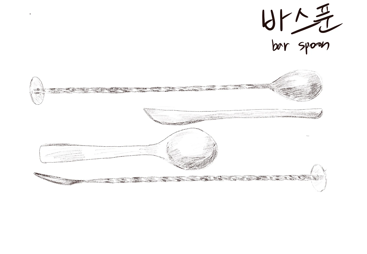 그리고 그다음으로는 바 스푼(bar spoon) 처음엔 왜 이렇게 과한 스푼을 써야 하는지 의문이 많았다. 길고 구블구블한 바 스푼은 어쩐지 겉멋의 진액처럼 느껴졌기 때문이다. 그것은 큰 오해였다. 바 스푼에게 심심한 사과를… 가장 많이 필요했다. 우리는 섞는다는 표현을 할 때 휘휘 젓는 모습만 떠올린다. 비중이 다른 음료를 섞을 때는 위아래로 저어줘야 하는데 그럴 때는 얼음을 들썩거리며 섞어야 한다. 이 때는 일반적인 얕은 수저로는 하기가 어렵다. 그리고 옴폭 들어간 숟가락 부분도 다르다. 밥 먹는 숟가락은 면적이 넓어 겨우 층층이 쌓아놓은 (빌드 build) 칵테일이 마구 섞인다. 얇은 바 스푼은 그 면적을 최소화해서 그럴 일이 적어진다. 게다가 바 스푼으로 믹싱 컵에 섞는(stur) 연습을 하고 나니 얼음을 깨지 않고, 음료는 차갑게 만들 b 수 도 있다. 아이스커피에, 칵테일에 안 쓰이는 데가 없는 배구팀의 리베로 같은 존재다.