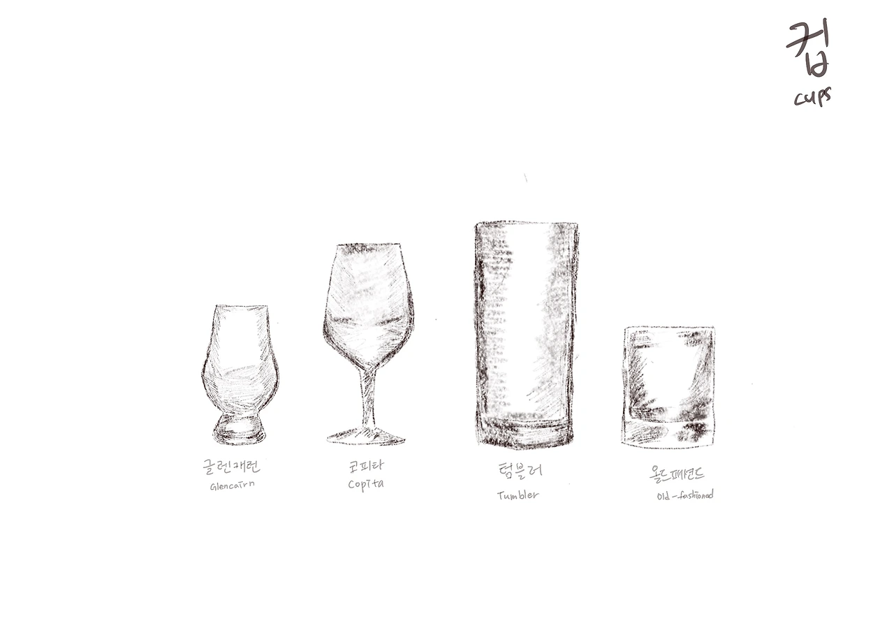 찬장에 적당한 컵이 생각보다 없다. 사이즈가 맞아도 불투명하거나, 모양이 그려져 있는 컵은 막상 만들어보면 ‘보는 즐거움’이 떨어진다. 만드는 과정과 보는 즐거움이 있는데 아쉽다. 원가 계산해보면 이 한잔이 얼마인데- 보는 재미도 놓치지 말고 챙기자. 칵테일 용량에 맞는 컵들로 구색을 맞추면 한층 만들어 먹기 편하다. 올드패션드 잔에 온 더 락을 먹는 즐거움, 텀블러 잔에 예쁘게 올라온 하이볼을 마시는 즐거움. 글랜 케런 잔에 미끄러지는 위스키를 보는 즐거움은 다 다르다. 그리고 이왕이면 컵이 미끄러지지 않게 코스터도 준비해두면 좋다.