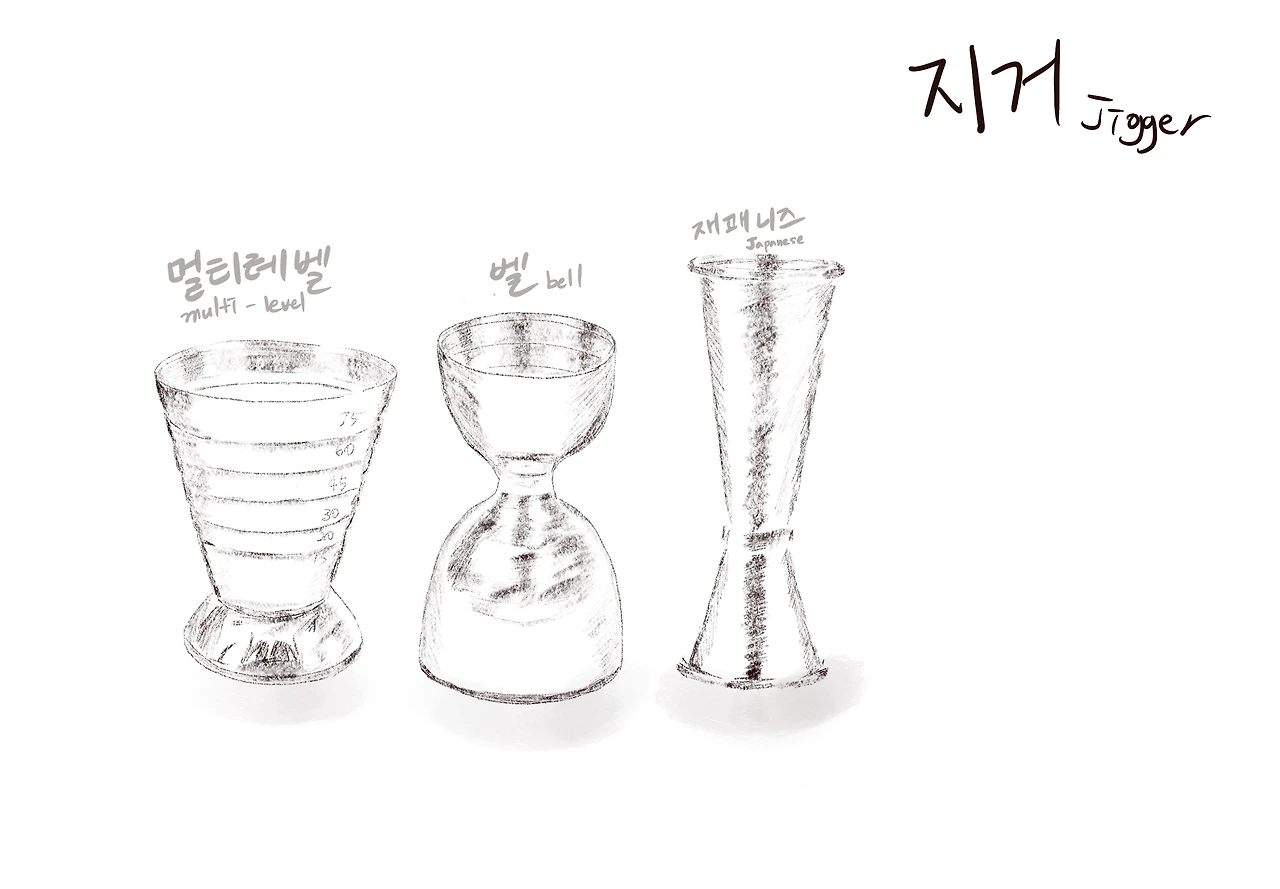 수많은 지거 중에 나에게 맞는 건 재패니즈 지거(Japanese jigger)였다. 적당한 길이와 무게 중심이 나에게 딱 맞았다. 게다가 내가 좋아하는 용량인 1.5oz(45ml)가 기본 값으로 되어있어서 편리했다. (지거로 연필 돌리기 재미있음!) 그리고 동그란 지거(bell jigger)는 예뻤다. 갖고 싶었지만 역할이 겹쳤기 때문에, 초보에게 용량을 정확하게 알려주는 다층형 지거(multi-level jigger)로 구매했다.