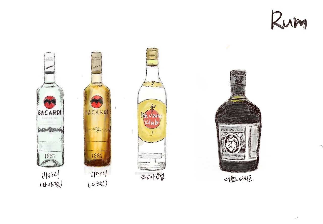 그리스인 조르바와 헤밍웨이가 좋아하던 술. 그리고 캐리비안 해적, 잭 스페로우가 대롱대롱 달고 다니던 술이다. 사탕수수를 증류한 럼은 달달하고 거칠다. 그래서인지 시원한 음료들과도 궁합이 좋아 캐러비안 해변의 해적들이 좋아했을 것 같다.