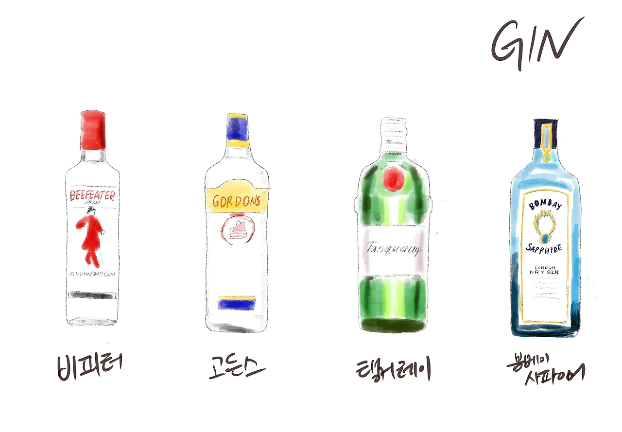 알싸한 향이 나는 진. ‘런던’이 자연스럽게 붙는 ‘진 Gin’의 시작은 18세기 네덜란드에서 쥬니퍼베리를 활용한 ‘쥬니버’라는 약술(한국에선 리큐르로 알려진 볼스의 쥬니버 Bols Genever)이 먼저 나왔다. 이걸 19세기 영국 런던에서 연속 증류기를 사용해 드라이하게 만든 것이 ‘런던 드라이진’의 시작이다. 증류를 한번 할 때마다 도수가 팍팍 올라가는데, 이걸 근대화된 기술로 연속으로 두 번 증류를 하면서 아주 드라이한(센..?) 술이 된 것이다.