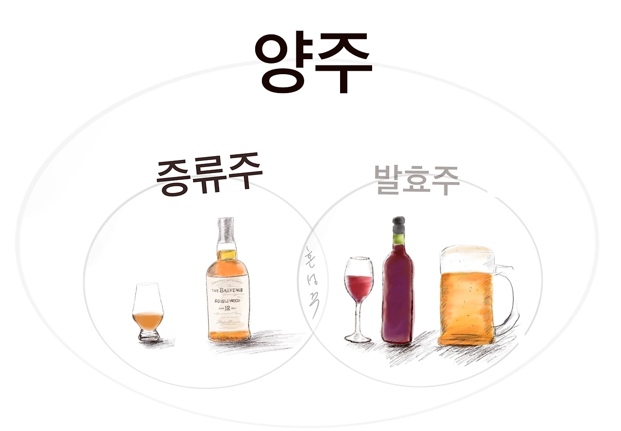 이전 글에서 양주를 크게 두 가지로 나누어 보았다. 재료를 발효시켰는가 “양조주”, 증류시켰는가 “증류주”. 그리고 두 가지를 섞어서 만들면 “혼성주”가 된다. 아쉽지만 이 구분만으로 어떤 술인지 상상이 되지 않는다. 인간으로 치면 성별 구분만 듣고, 평소에 입고 다니는 옷 스타일 상상할 수 없는 것과 비슷한 이치다.