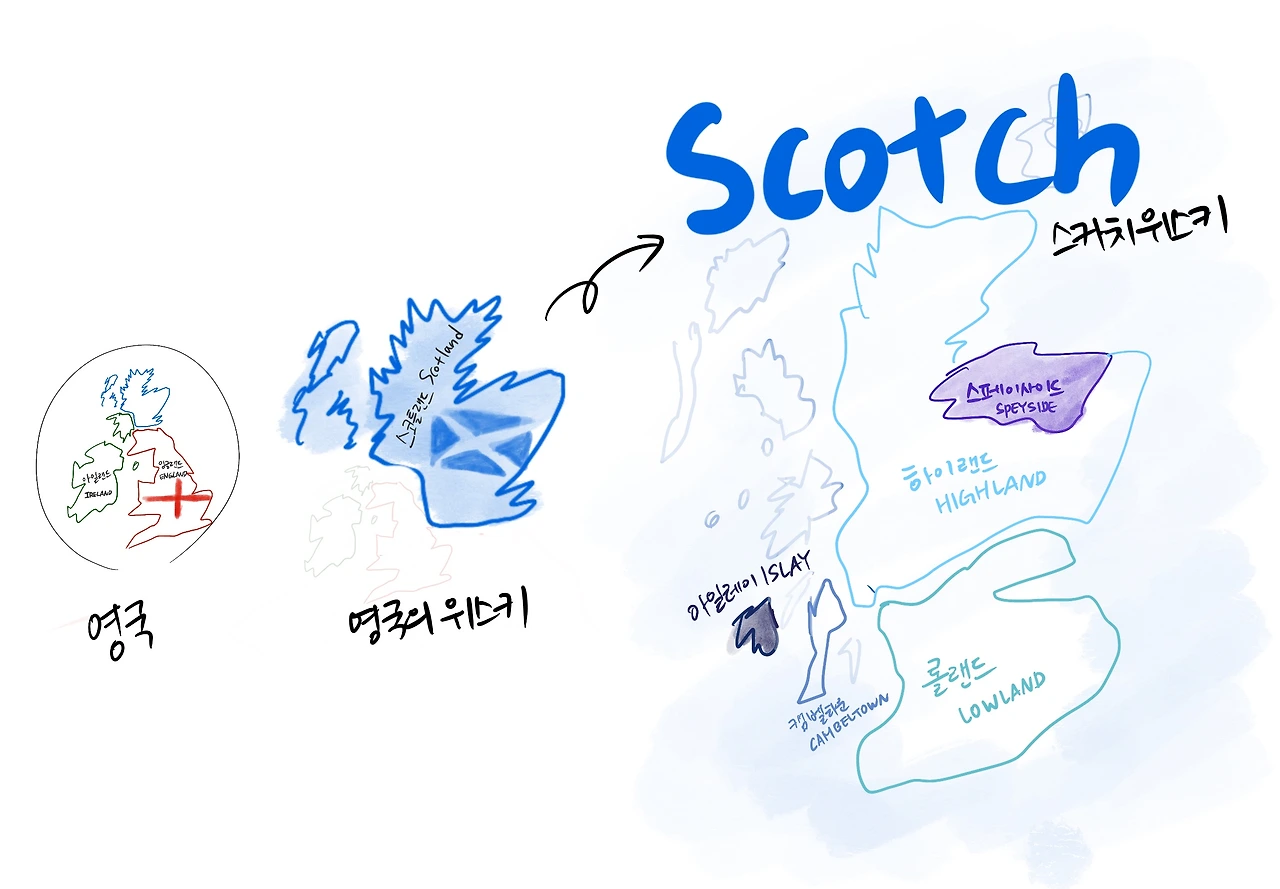 위스키로 한정해놓고 보면 영국이라는 나라의 대부분은 ‘스코틀랜드’다. 아일랜드에서도 나오지만, 위스키가 가장 많이 만들어지는 영국의 4개 왕국 중 하나는?이라는 질문이 나온다면 답은 아무래도 ‘스코틀랜드’ 일 것이다. 위스키 병들마다 정확하게 ‘스카치위스키’라고 써져있는데 여기에서 어쩐지 깊은 감정의 골이 느껴진다. 다른 단어도 있는데 스코틀랜드를 쓰는 것이다.