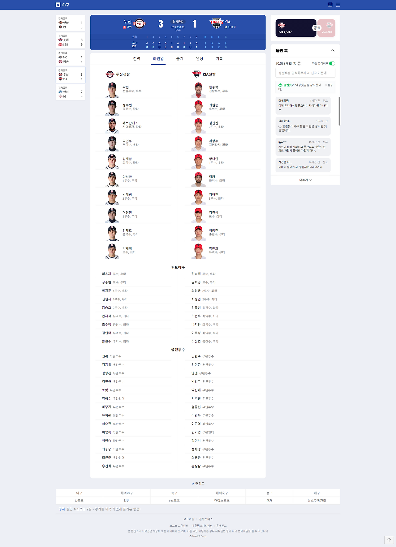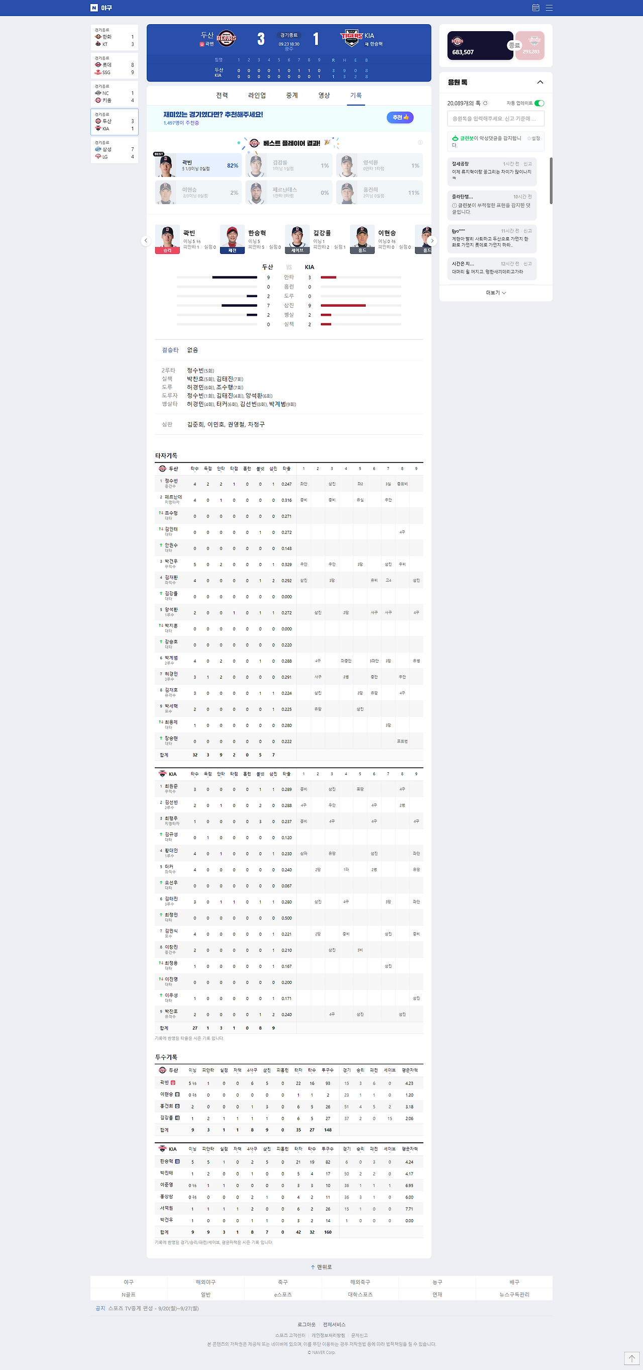이렇게 짧지만 대략적인 얼 게를 알 수 있는 박스스코어는 쓱 한번 경기 흐름을 보고 싶을 때 유용하다. 네이버 스포츠의 기록은 이에 반해 화려함으로 승부를 해서 볼거리가 많아졌다.