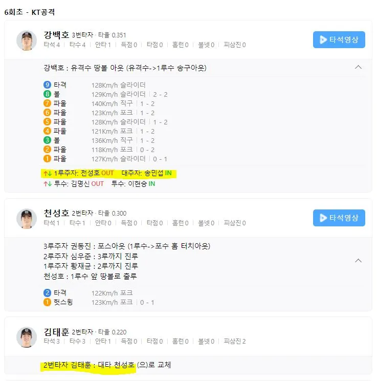 물론 네이버에서는 이런 부분도 놓치지 않는다. 모든 공마다 기록이 남아있기 때문이다. 이걸 같이 보면 저 요약표의 소소한 이슈는 바로 교정이 된다. 하지만 이 확인을 위해 사용자가 6회 초 기록까지 가서 모든 공의 진행상황을 확인해볼 만큼 이 변화 중요한지는 고민해볼 필요가 있다. 선수가 어떻게 변화되었냐는 큰 정보를 얻기 위해 거치는 수고로움이 꽤 크기 때문이다.