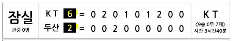 야구가 각 회마다 어떻게 진행되었는지 보여준다. KT가 먼저 점수를 내고, 두산이 따라갔는데 4회부터 두산 실점이 이어지고, 6-7회에 쐐기가 박혀서 6:2로 두산이 졌구나 라는 걸 알 수 있다.