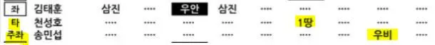 이 땅표로 한 번에 알 수 있는 건, 찬스를 얻은 KT가 큰 기대를 걸고 6회에 좌익수 자리에 있는 "김태훈"을 빼고, 에 "천성호"를 냈고 결과는 실패 1땅 (1루 땅볼 아웃)을 했다. 천성호는 큰 걸 한방 치는 선수인지 주자를 (주좌 중의 -주) "송민섭"으로 바꿨다. 아마 2번에 맞는 날렵한 선수 일 것 같다. 그 다음 회부터 좌익수 수비도(주좌 중의 좌 ) "송민섭"이 대신했다- 는 걸 알게 되고 송민섭은 어쩐지 대주자를 할 만큼 날렵하고 수비를 잘하는 선수인 것 같다는 예상을 하게 된다. 기록상에 빈틈이 없는 건 아니다, 어떤 타이밍에 대주자로 들어갔을지는 정확하지 않지만- 7회에 따로 기록이 없는 걸 봤을 때는 6회에 1땅을 친 이후에 대주자로 들어간 것 같다.