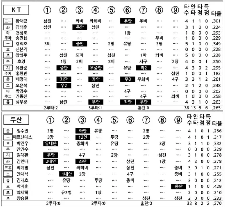 그 밑에는 아래와 같이 각 회당 어떤 식으로 점수가 났는지를 보여주는 타석별 기록이 나온다. 각 팀 명, 선수 이름 왼쪽에 한자는 수비 위치를 말한다. 수비 위치에 네모 테두리가 되어있는 사람들이 해당 수비 위치로 선발 출장한 사람들이다. 네모 테두리가 없는 선수들은 교체 선수다.