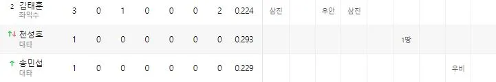 반면 네이버 기록은 다소 오해를 하게 된다. "김태훈" 자리에 "천성호"를 대타를 넣었고 마치 좌익수 수비도 7회에 한 것처럼 보인다. 그리고 다시 8회 타선이 돌아왔을 때 "송민섭"을 대타로 넣은 것처럼 느껴진다. -땅표로 파악한 흐름과 다르다. - 그러면 내 상상 속에서는 천성호도 뭔가 덩치가 큰 타자 같고, 송민섭도 그런 선수인가 하는 상상을 하게 된다. 선수를 두 번 바꿀 만큼 중요한 국면이 왔나 보다 싶은 것이다. 송민섭을 보면 어쨌건 결과가 우익수 쪽으로 플라이를 날릴 만큼 큰 걸 노리는 선수인 듯하니까. 이러 식으로 땅표에서 상상한 게임과 달라지는 것이다.
