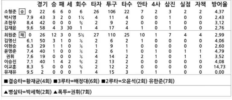 그리고 이제 투수 관련 기록을 볼 때다. 진 거는 알겠고, 누가 못 쳤는 줄은 알겠다. 그러면 투수는 대체 누가 무너진 걸까?