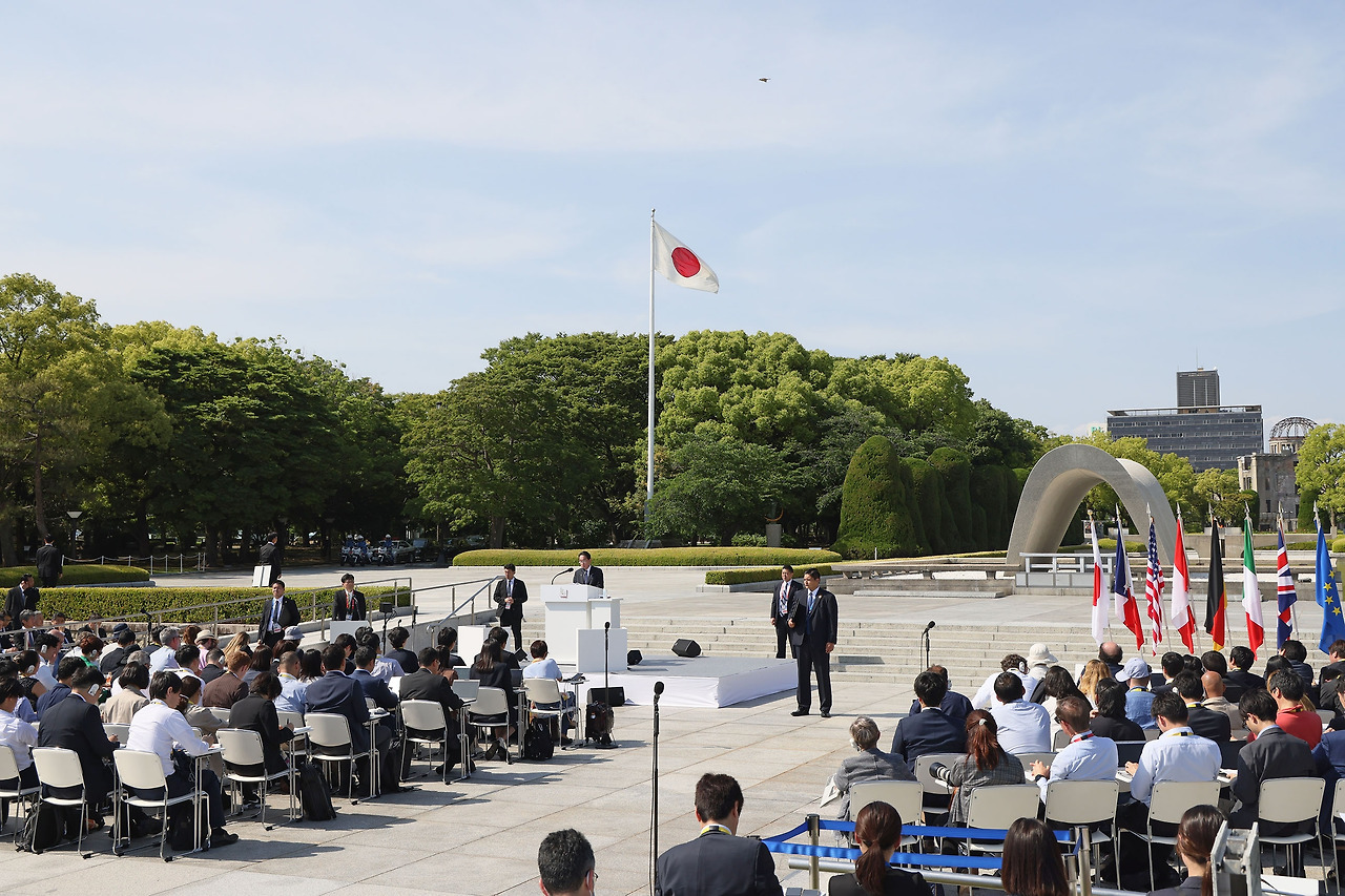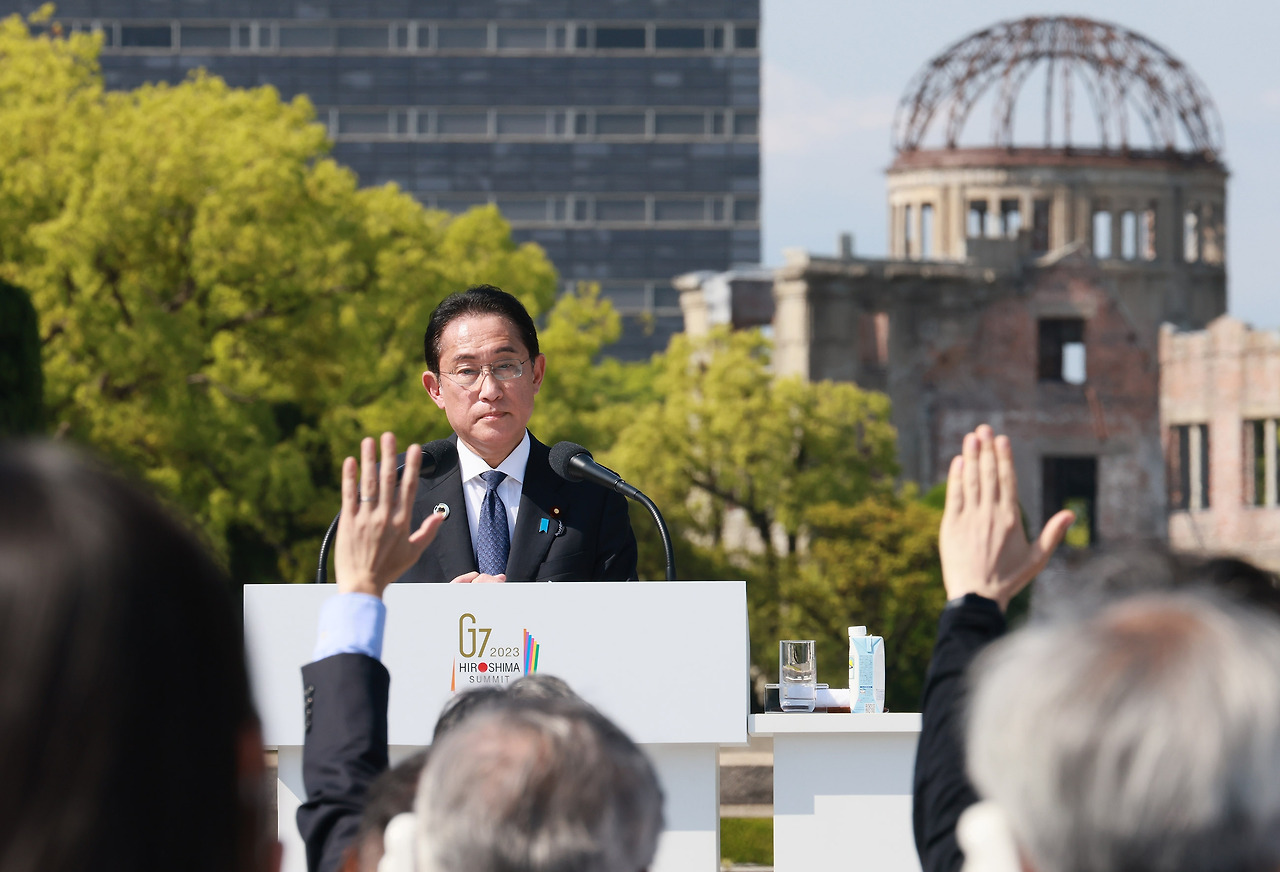 히로시마 원폭 돔이 한눈에 들어오는 곳에서 G7 의장국 기자회견이 개최됐다. 기시다 총리가 기자들의 질문에 대답하는 시간이었다.