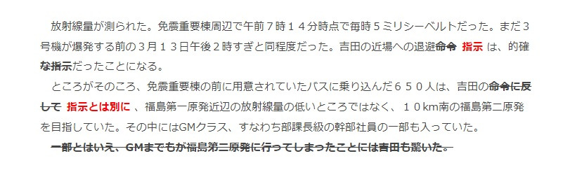 아래 기사 이미지에서 두 번째 수정 부분인 '명령에 반해서'는 '지시와는 별도로'로 수정했다. 현재는 삭제된 것으로 표시된 마지막 줄엔 '일부라고는 하지만 GM까지도 후쿠시마 제2원전으로 가버린 것에는 요시다도 놀랐다"라고 쓰여 있었다. GM은 부.과장급 간부 사원을 뜻한다.