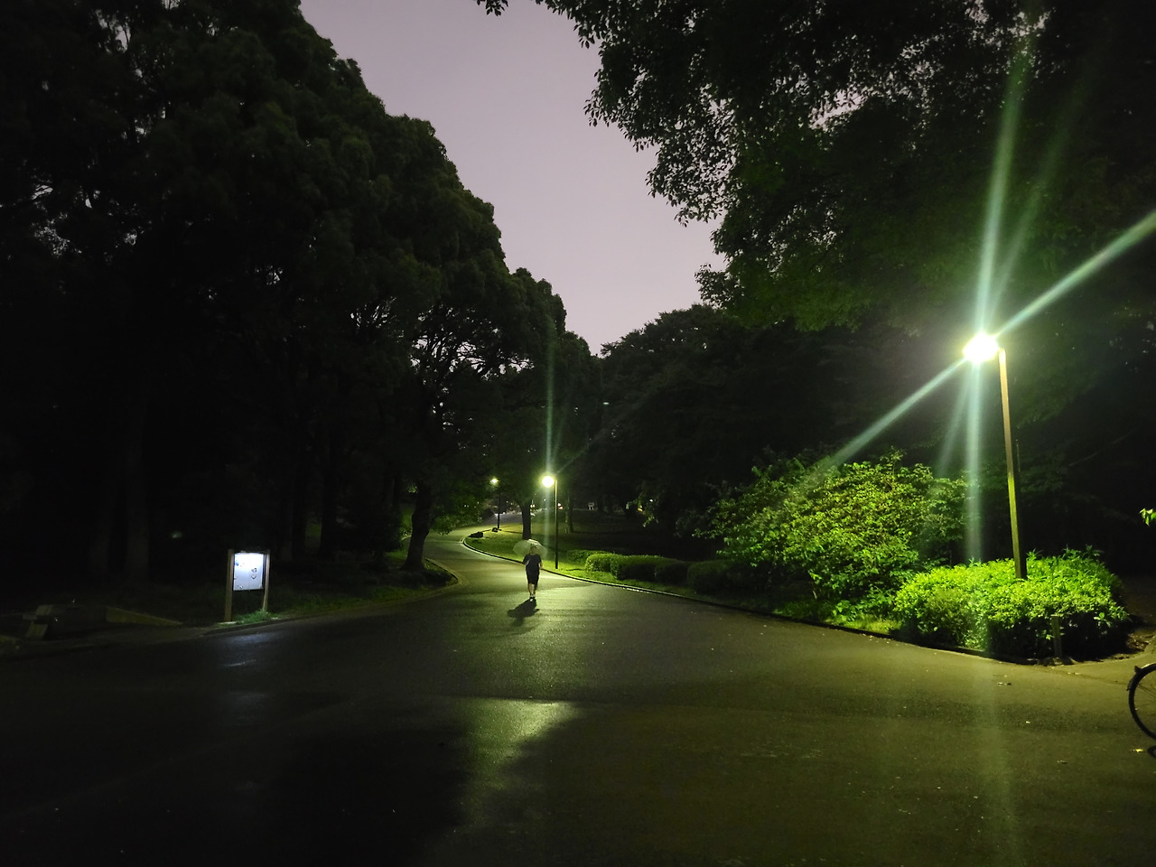 역시 달리는 도중 업무연락이 왔다. 휴대폰으로 일처리를 할 수밖에 없어 흐름이 끊겼다. 그래도 달리다 걷다 하며 두 바퀴가량을 돌았다. 비 오는 밤의 요요기는 고요하다.
