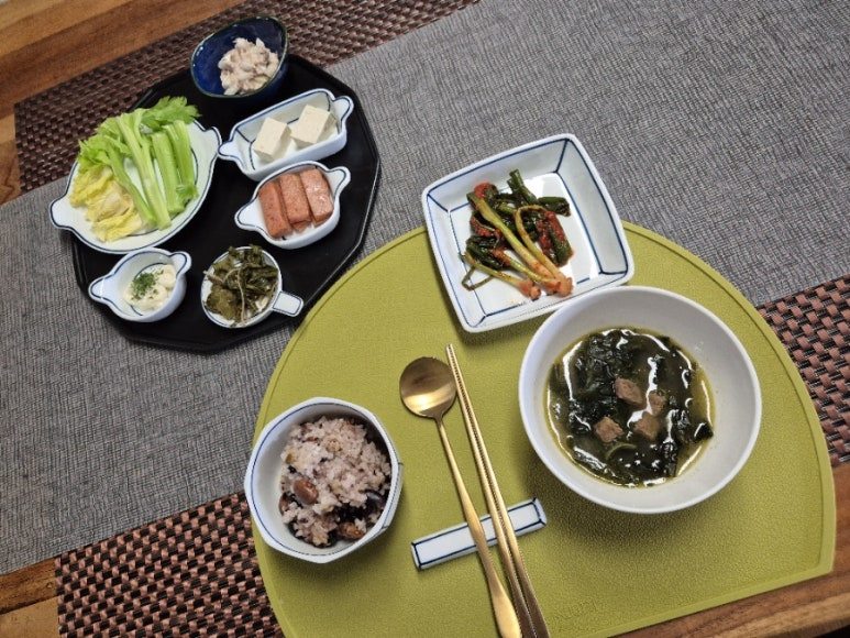 “고기가 조금 남아 있길래, 미역국 좀 끓였어. 반찬 몇 가지 같이 했고.”