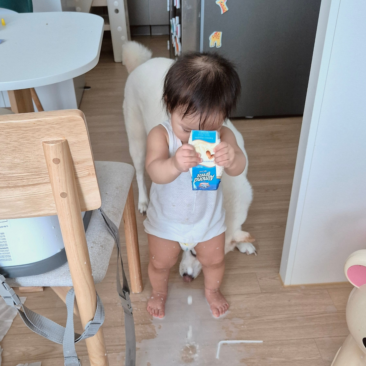 강아지들은 이미 두유 파티에 신이 났고, 아기는 자랑스러운 듯 그들을 바라봤다. 어쩌면 얘는 나보다 더 나은 사회성을 가진 걸까? 사회적 나눔을 몸소 실천하는 14개월 아기라니, 나는 아이에게 "공존의 미학"을 배우고 있는 건가 싶기도 하다. 문제는 그 공존의 대상이 강아지들이라는 점이지만 말이다.