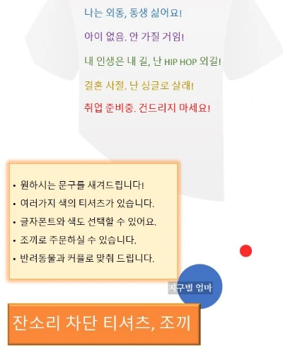 먼저 명절 티셔츠 또는 조끼가 있다. '아이 없음. 안 가질 거임', '내 인생은 내 길, 난 힙합 외길', '싱글로 살래. 결혼 사절', '나는 외동. 동생 싫어요!', 등등의 문구가 새겨진 명절 티셔츠를 또는 조끼를 제작할 수 있다.