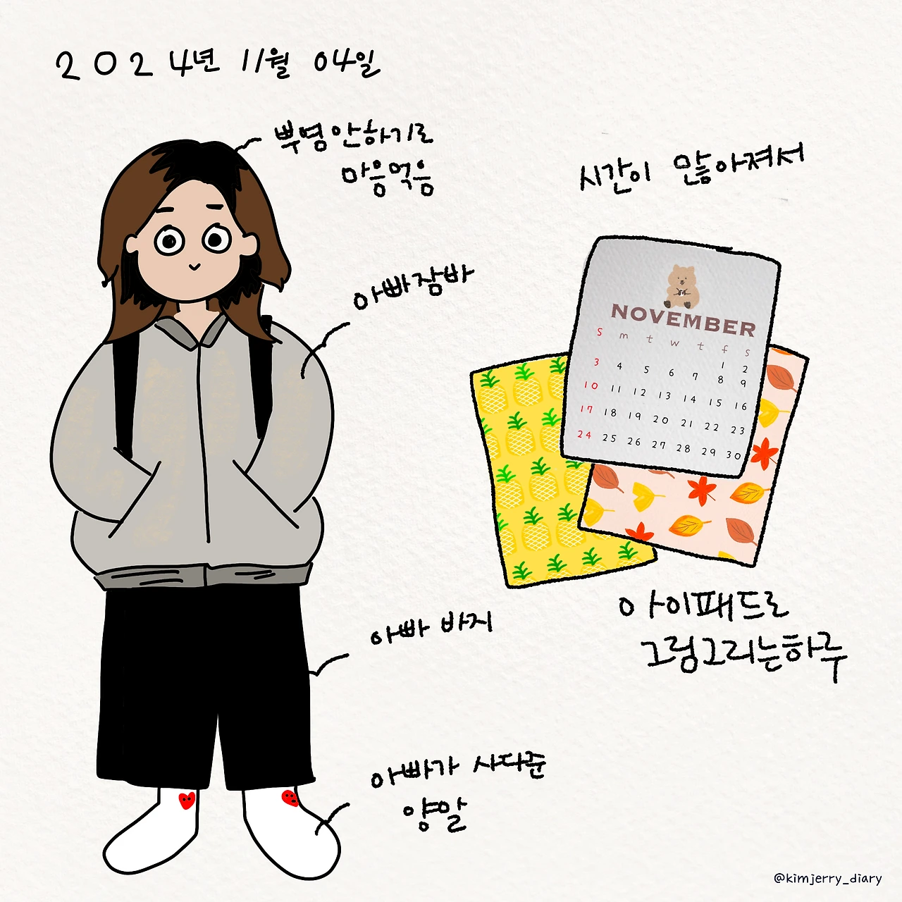 2달전 전 아빠가 구입한 바지가 남아서 엄마가 “입을래? 넌 이상하게 아빠가 입던 옷 좋아하잖아.” 라며 건네줬다. 행거에 걸어두고 요며칠 날씨가 쌀쌀해져 꺼내입었다. 지금보다 10kg가 쪄도 입을 수 있는 크기다. 어제는 당근에서 외투를 샀는데 입어보니 활동하기 불편하다며 엄마가 또 건네어주었다. 엄마는 아빠에게 비서인걸까? 저녁에 집으로 돌아온 아빠가 보여서 외투를 걸치고 “어때?“ 묻자 ”그 옷은 바지에 입어야되“ 라며 넷플릭스가 틀어진 화면에 시선고정중이었다. 본거 맞아? 신기했다.