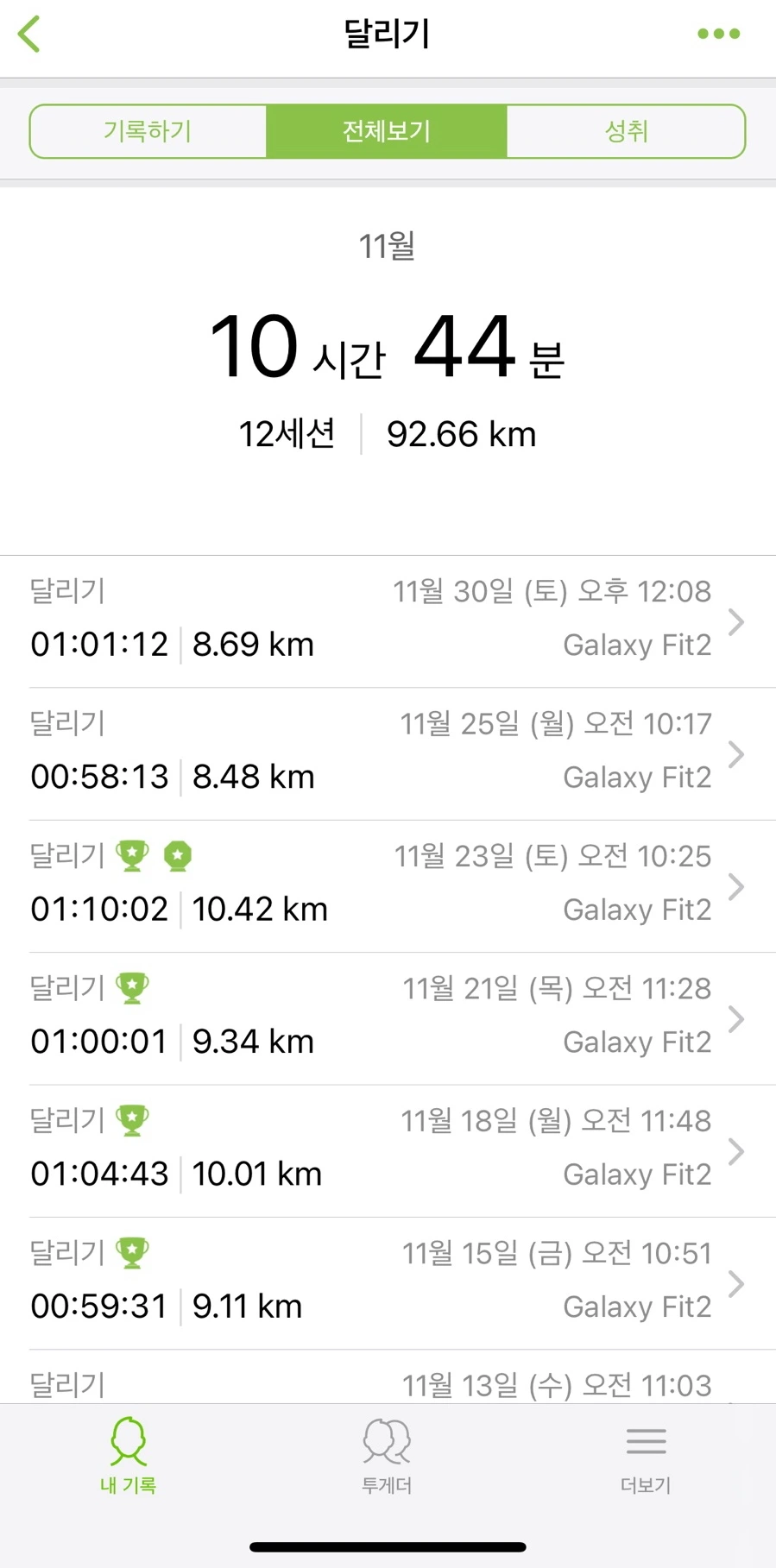 이번달에는 총 92.65km를 달렸다. 8월에는 30-40분은 걷거나 달리다가 9월부터 거리를 기준으로 셌다. 3~5km를 달리다 최근에는 10km나 1시간으로 늘려서 달린다. 이때 스마트워치(나는 갤럭시핏 2를 쓰는데)가 없으면 달랄맛이 안 난다. 심박수랑 거리도 재보고 풍견도 보는 재미가 쏠쏠하다.