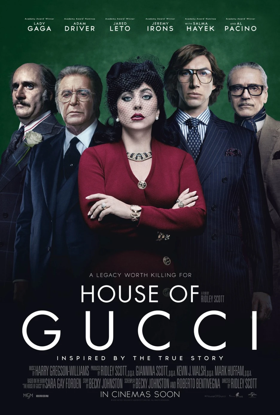 지난 10월 <라스트 듀얼: 최후의 결투>로 만난 지 3개월 만에 다시 보게 된 리들리 스콧 감독의 신작, <하우스 오브 구찌>입니다. 레이디 가가, 아담 드라이버, 자레드 레토, 알 파치노, 제레미 아이언스, 셀마 헤이엑, 잭 휴스턴, 카미유 코탱, 리브 카니 등이 이름을 올렸죠. 포스터 맨 위 아카데미상 수상/후보란이 빈 배우가 없는 것만 봐도 어마어마한 사람들이 모였음을 짐작할 수 있습니다.