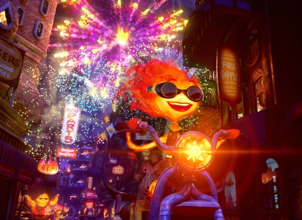 물론 창의력과 상상력으로 가득한 화면은 이제 기본입니다. <토이 스토리 4>쯤부터 적극적으로 활용하기 시작한 빛을 다시 한 번 적극 끌어들여 엘리멘트 시티를 형형색색의 원소들로 꾸몄습니다. 물길을 가르는 기차부터 유리를 빚어내는 불 등 때로는 크게 때로는 작게 비어져 나오는 기발함에 감탄하게 되죠. 가전제품 전시장에 틀어 놓아도 무방한 색감만으로도 충분한 볼거리가 됩니다.