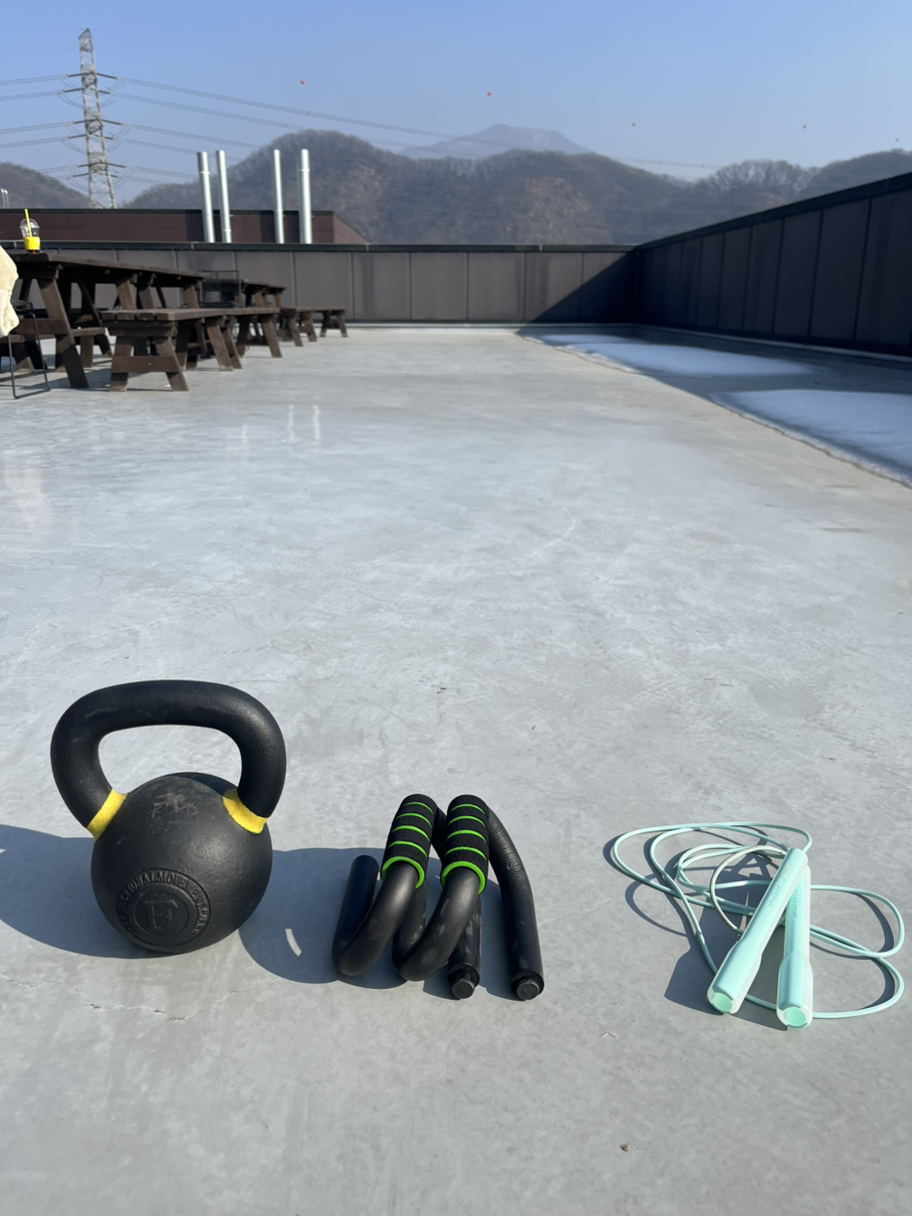 장소는 행사가 없으면 쓰이지 않는 옥상. 점심시간마다 올라와 운동을 했다. 짧은 시간 내 효율이 높은 운동을 해야 했다. 그래서 택한 게 케틀벨, 푸시업, 줄넘기 총 세 가지 운동이다.