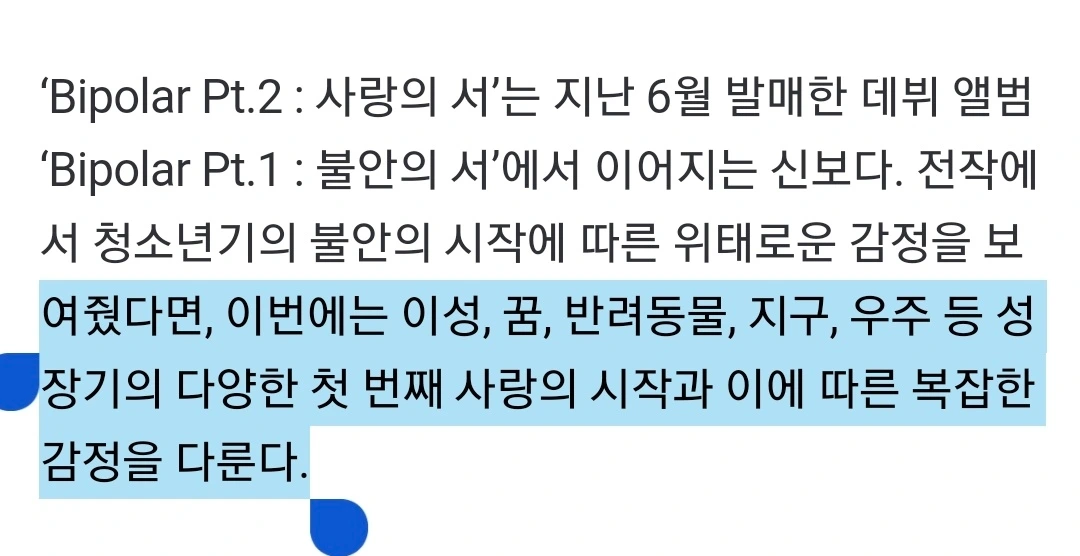 불안조차 이기게 하는 사랑에 대한 노래일까. 약간의 기대를 했던 것도 사실이다. 레드벨벳처럼 (레드벨벳도 처음에 1 앨범 레드-강렬한 곡, 1 앨범 벨벳-발라드 이런 식으로 번갈아가면서 앨범을 내려다가... 결국에는 흐지부지되었던 것으로 알고 있다) 그래도 데뷔 앨범에 첫 컴백이니까, 한 앨범은 락다운, 한 앨범은 두포미 스타일로 가는 건가. 그랬으면 좋겠다. 팬들이 청량을 엄청 기다리기도 했으니까.
