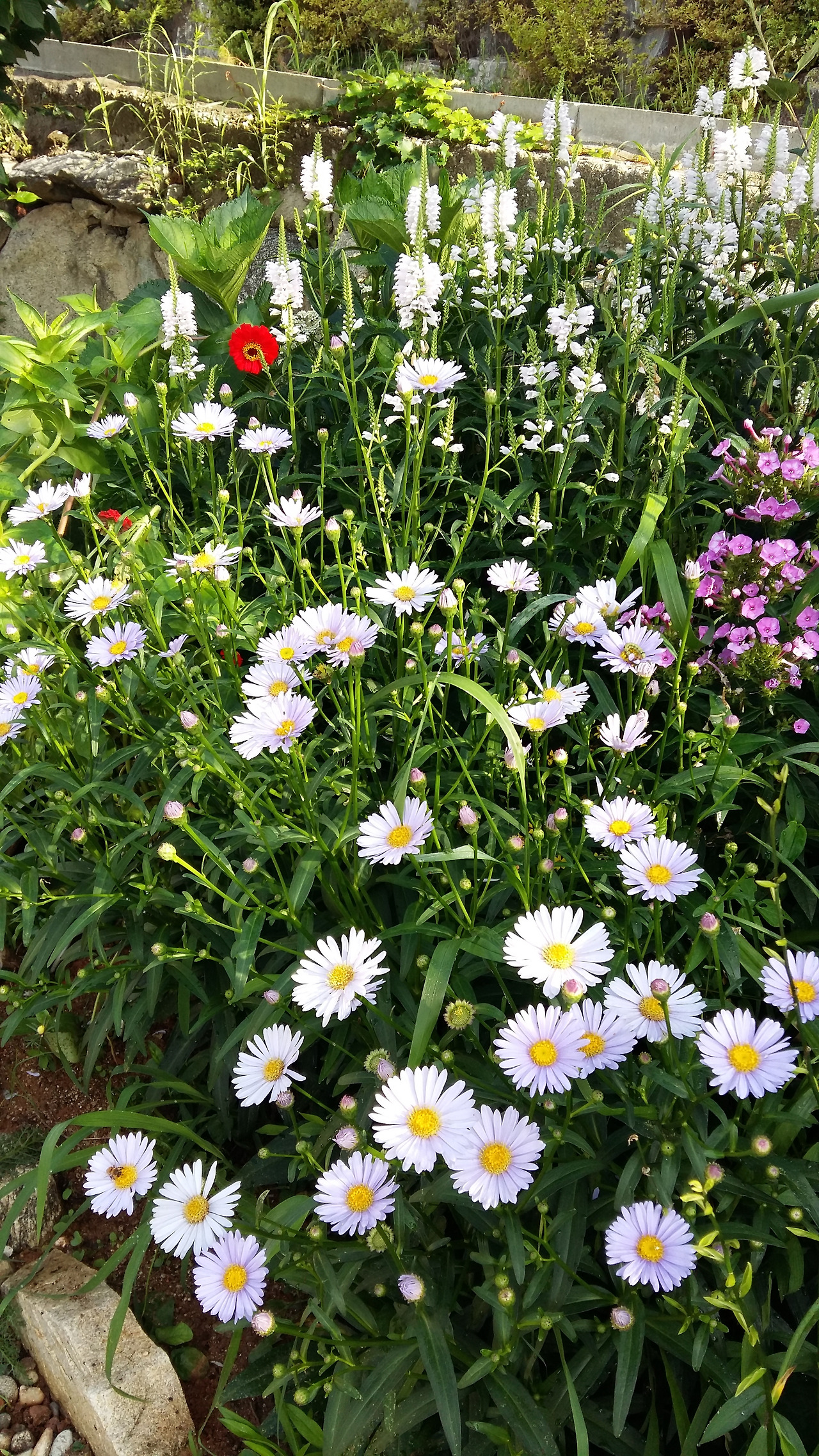 앞에 있는 꽃이 벌개미취, 뒤쪽의 흰 꽃이 꽃범의 꼬리이다. 빨간 건 백일홍, 오른쪽이 후록스