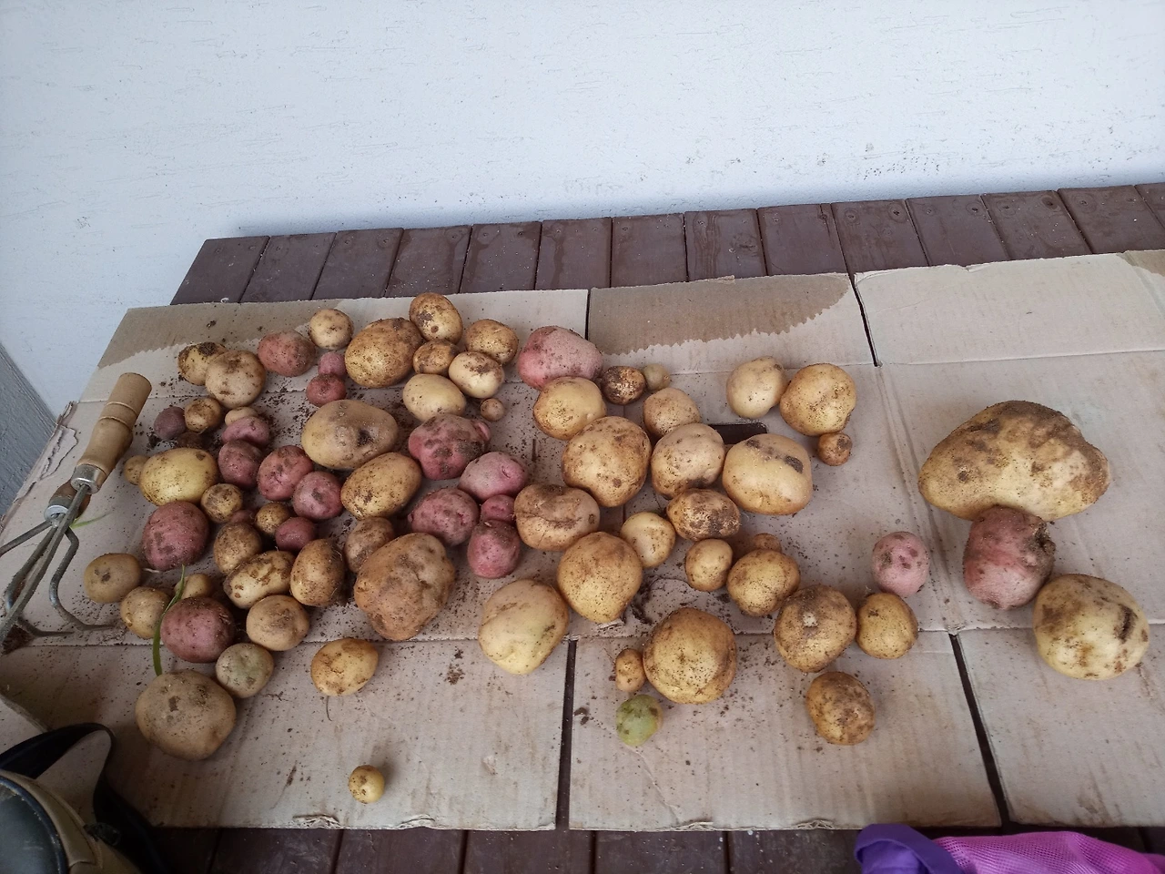 전날 비가 와서 감자에 흙이 묻어 그늘에서 말리는 중이다. 마른날에 캤으면 뽀얗고 깨끗한 감자를 봤을 텐데 주말 집이라 어쩔 수 없다.