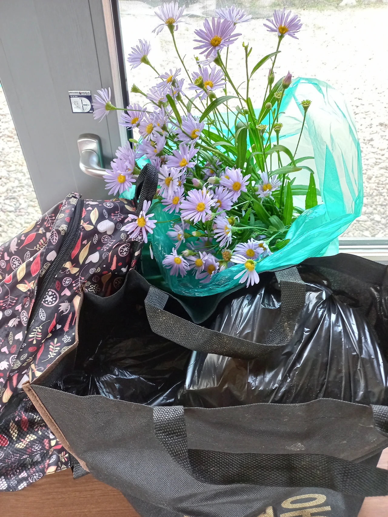 시누이는 깻잎을 낫으로 베어 이파리를 딴 다음에 장아찌도 만들고 삶아서 나물도 만들어 가져 갔다. 일을 하도 잘해주어서 이것저것 챙겨주고도 고마운 마음에 복숭아 농사짓는 이웃에게 두 상자를 사서 시누이에게 한 상자 주었다. 마지막으로 보라색 벌개미취를 잘라 꽃 좋아하는 시누이의 짐꾸러미 위에 얹어주었다.