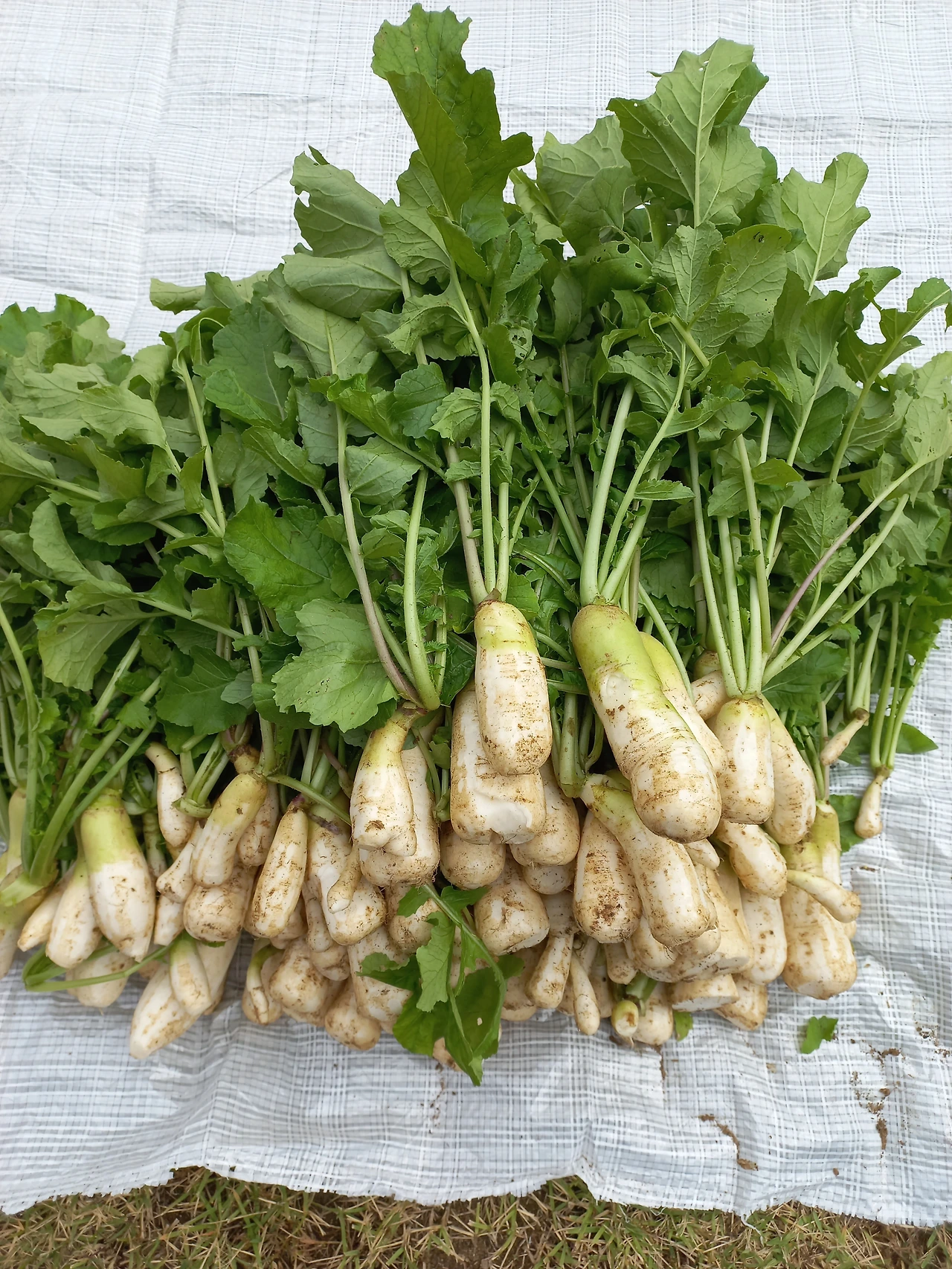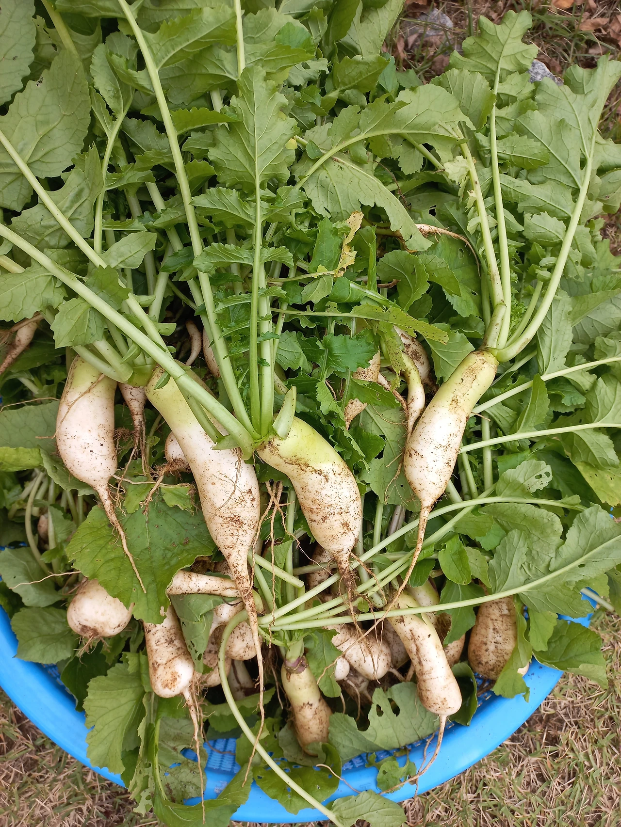 알타리는 그런 내 마음을 달래주듯이 풍성하게 잘 자랐다. 무는 아직 성장이 더디지만 비료를 하지 않으니 다만 수확 때까지 커지기를 기다릴 뿐이다. 햇살이 따사로운 일요일 오후에 남편과 알타리를 뽑아 잔디밭에 퍼질러 앉아 다듬기 시작했다. 아직 자잘한 알타리는 밭에 남겨 두었는데 커다란 소쿠리에 가득 담긴 알타리를 손질해서 마대자루에 담아보니 무거울 정도로 그득하다.