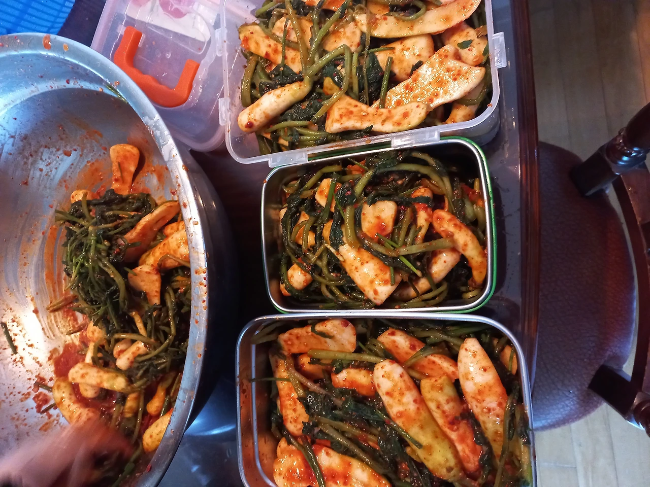 일단 아파트로 가져오긴 했는데 저 많은 것을 어찌 김치를 다 담을까 걱정이 되어 잠이 오지 않는다. 손질해서 씻어보니 싱싱한 이파리가 살아나 더 많아 보인다. 도저히 감당이 안 될 것 같아 김치 담을 때마다 도움을 받는 이웃에게 알타리를 나눠주고 나머지를 소금에 절였다. 숨이 푹 죽고 나니 그제야 양이 적당해졌다. 한식의 달인인 이웃이 와서 익숙한 솜씨로 양념을 섞어 쓱쓱 치대 주고 가셨다.