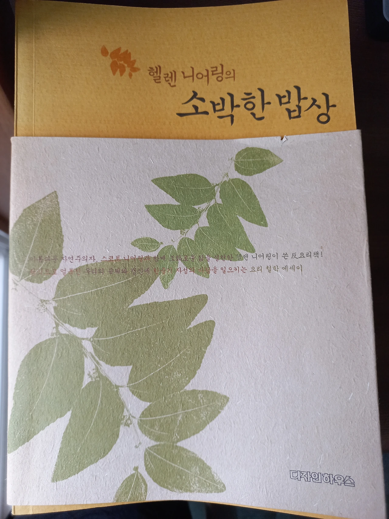 그러다가 책장을 정리하면서 발견한 책, 헬렌 니어링의 <소박한 밥상>을 다시 읽었다. 채식만으로 완벽한 건강을 누리다가 천수를 다하고 죽은 니어링 부부의 식단과 철학을 새롭게 받아들이게 되었다. 채소로 끓인 수프와 초록잎으로 만든 샐러드, 견과류, 씨앗 등으로만 유지한 식탁은 맛있고 풍족하며 소박했다. 확고한 신념이 있다면 채식만으로도 만족스러운 식생활을 할 수 있고 그것으로 행복을 충분하게 누린다는 걸 헬렌 니어링은 강조하고 있다. 그녀의 글은 자발적으로 식습관을 이끌어 갈 수 있는 새로운 영감을 내게 불어넣어 주기에 충분했다.