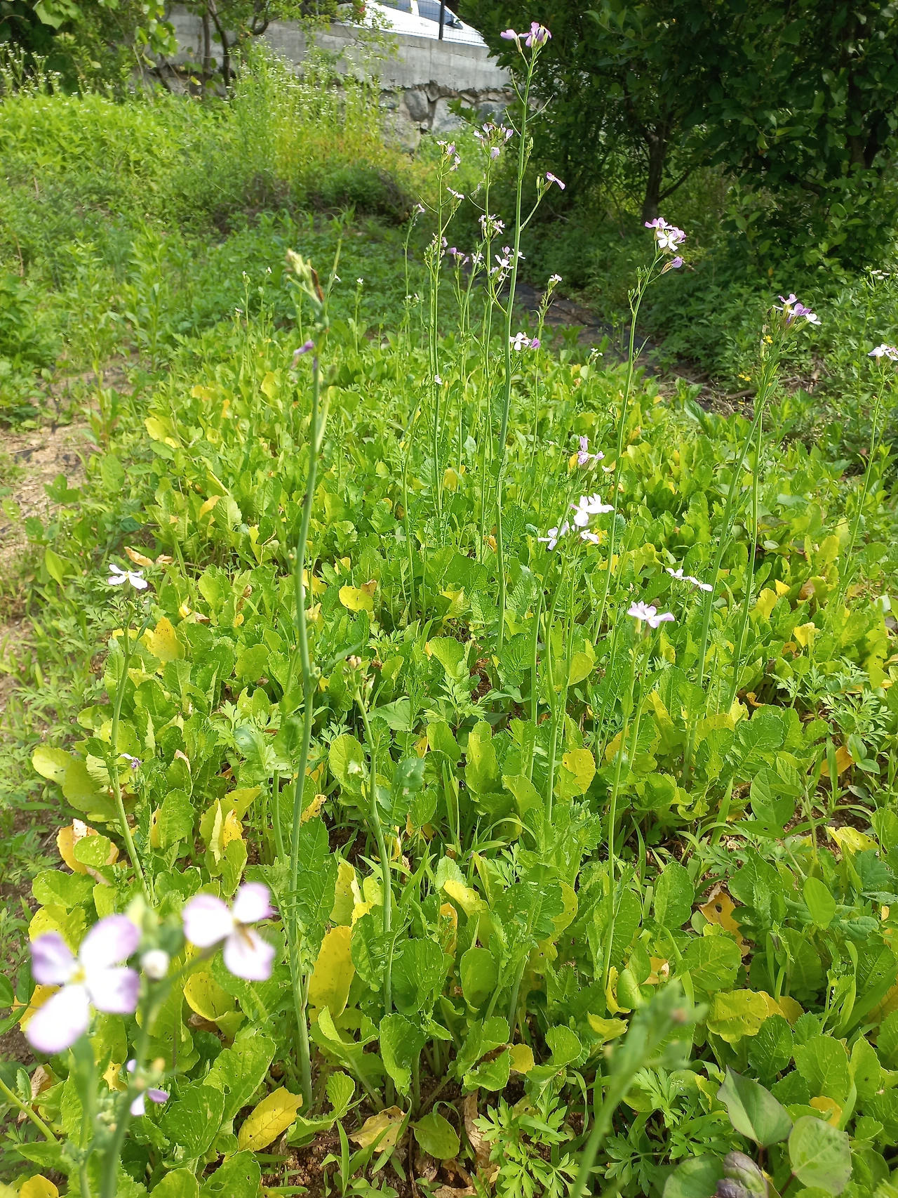 원래는 고구마를 심으려고 마련해 둔 밭이라 거름을 하지 않고 고구마 한 단을 심었는데, 심고 보니 간격이 넓어 그 틈새가 아까운 생각이 들었다. 열무는 초여름에 수확을 하니 고구마의 생장에 방해가 되지 않을 것 같아 열무씨 한 봉지를 사다 고구마 순 사이에 줄을 맞춰 뿌렸다. 열무는 물을 자주 주고 어느 정도 거름기가 있어야 잘 자라는데 봄가뭄이 심해 일주일에 한 번 가서 주는 물로는 부족하고 영양마저 없으니 잎이 노랗게 크지 않다가 일찌감치 꽃을 피웠다.