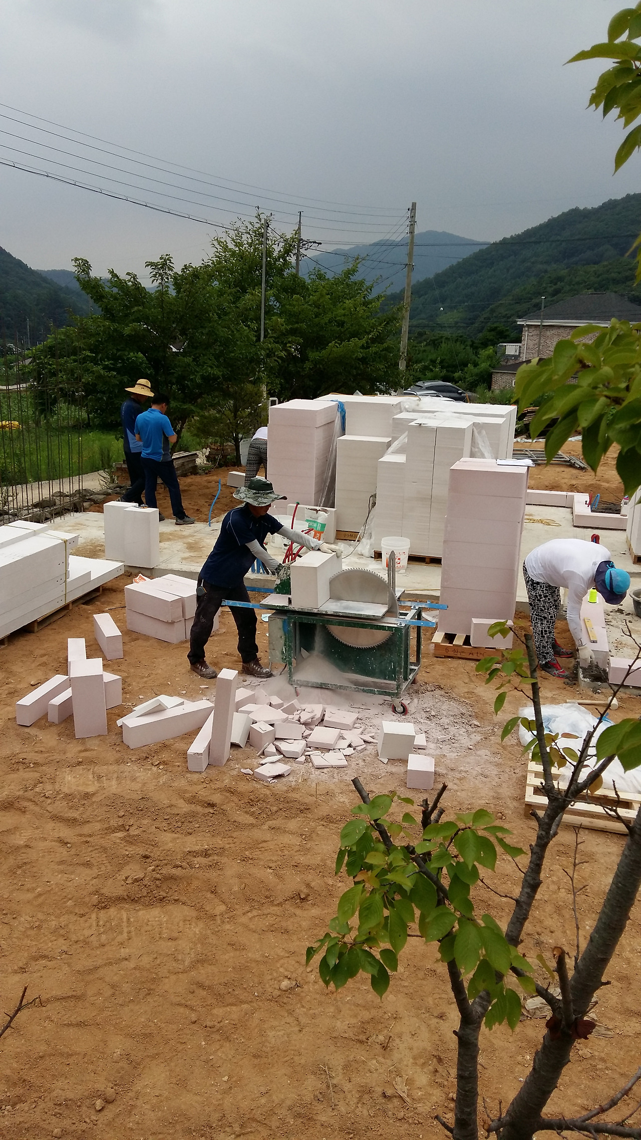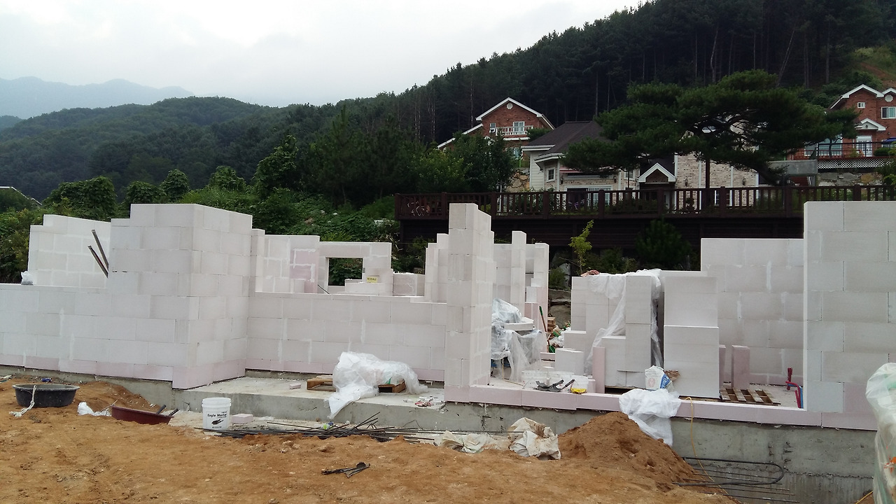 보름 동안의 기초 작업이 끝나자 하얀 ALC폼 블록을 실은 트럭이 일요일 아침 일찍 도착해서 집터에다 내려놓으니 금세 벽을 쌓아가기 시작했다.