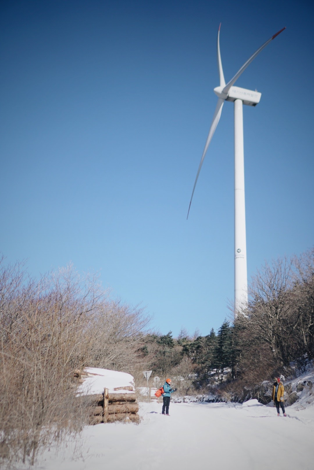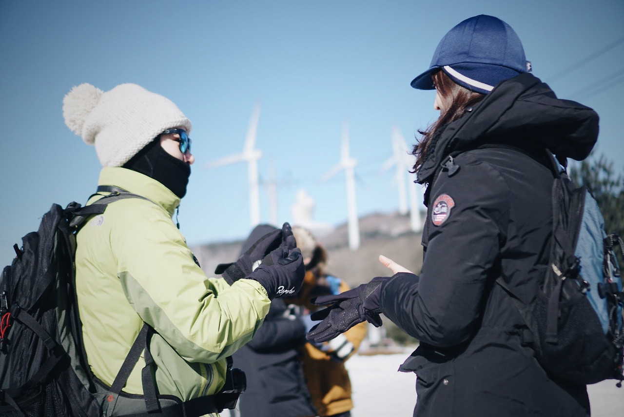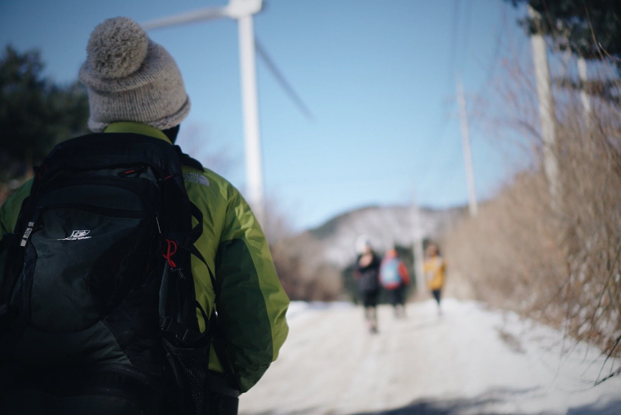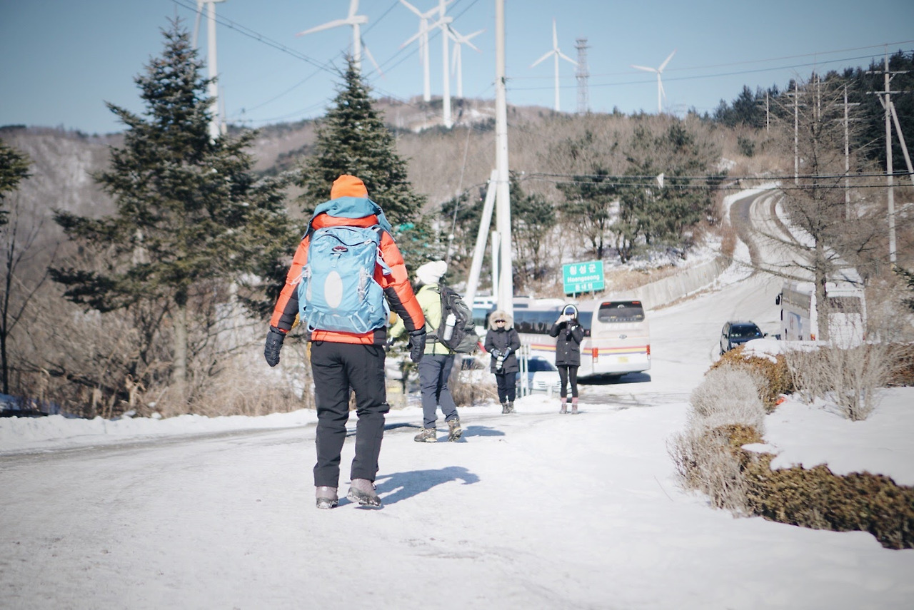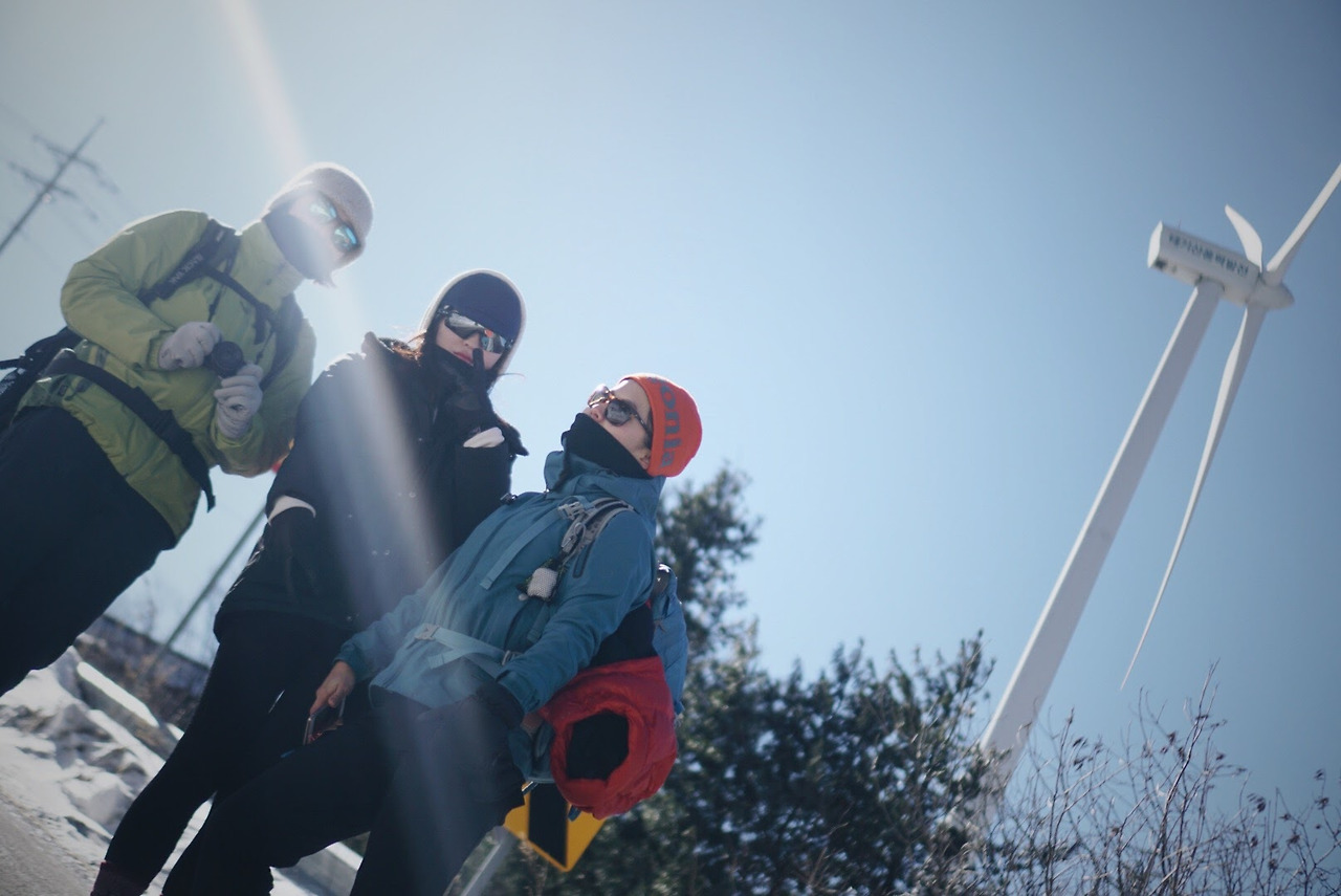 오늘 등산 아니 트래킹 코스를 따라가면 이렇게 풍력발전기를 옆에 두고 이동하게 된다. 발전기에 붙어있던 고드름이 떨어질 수 있으니 조심해야 한다.