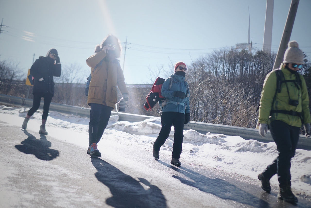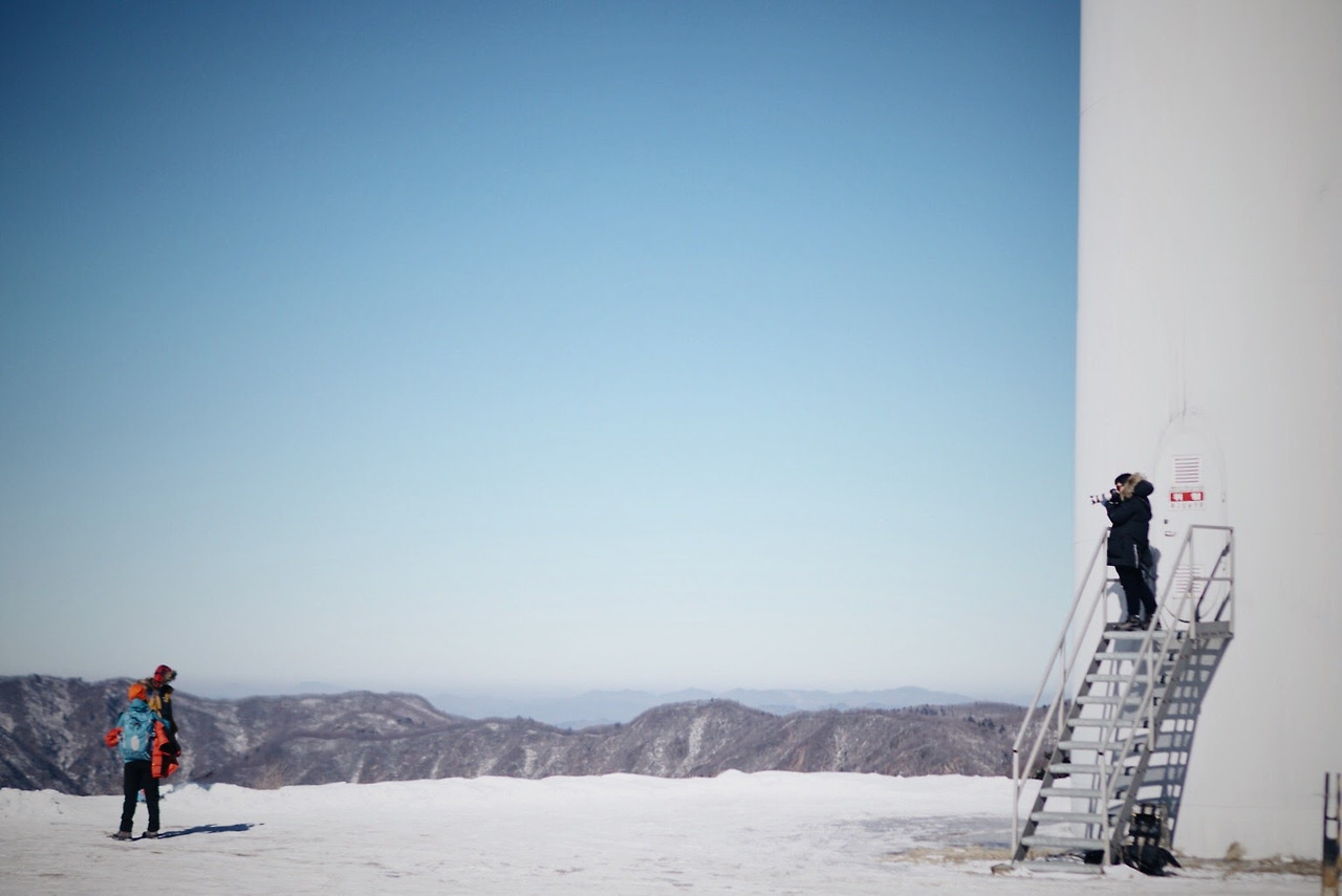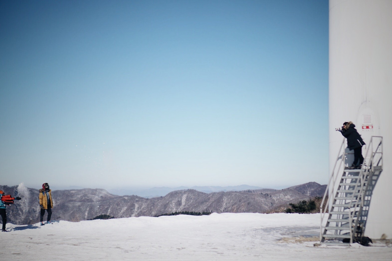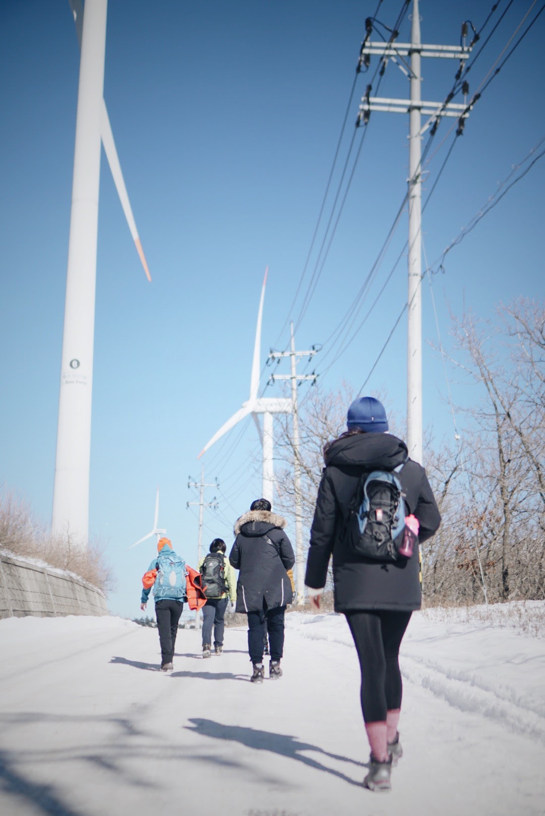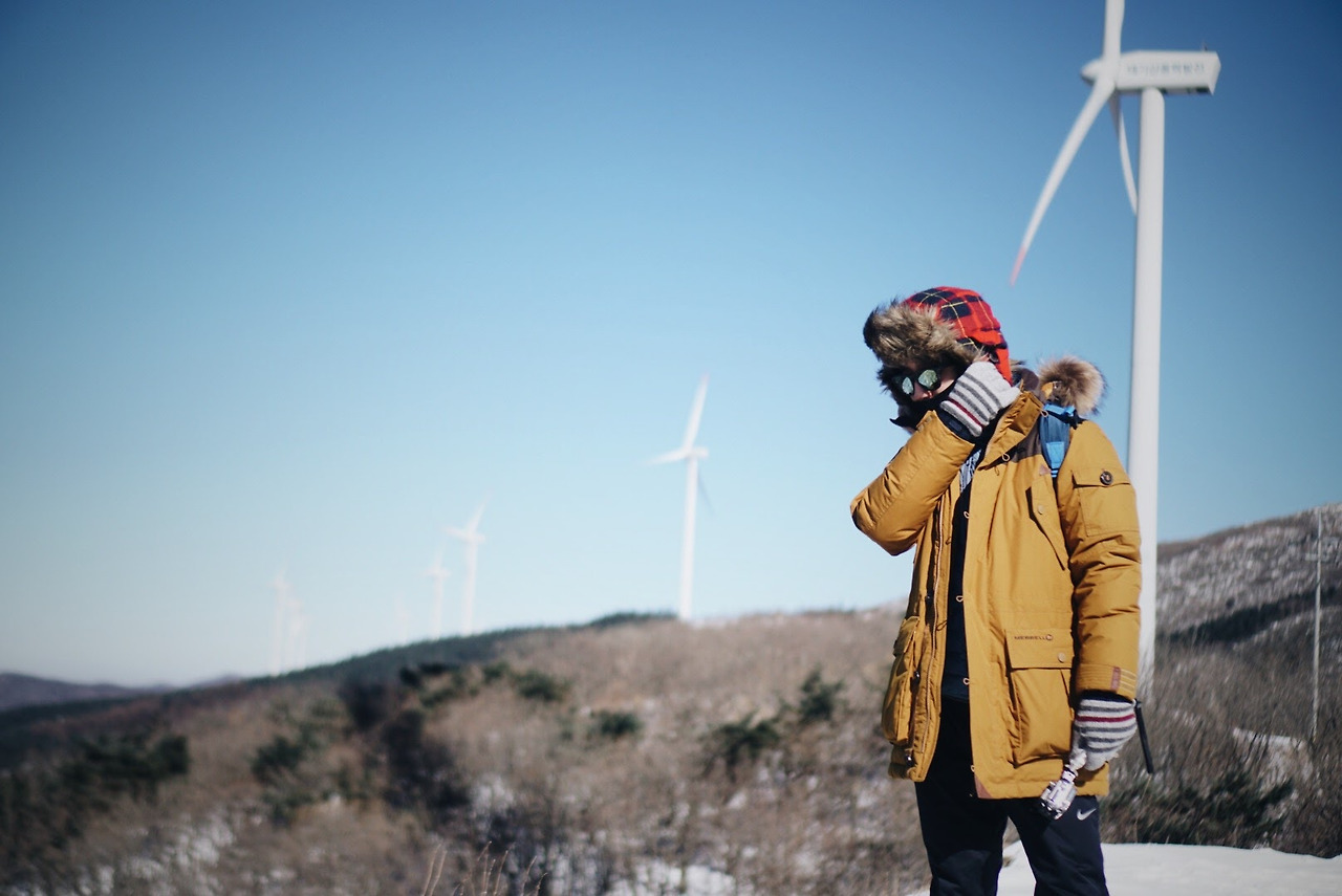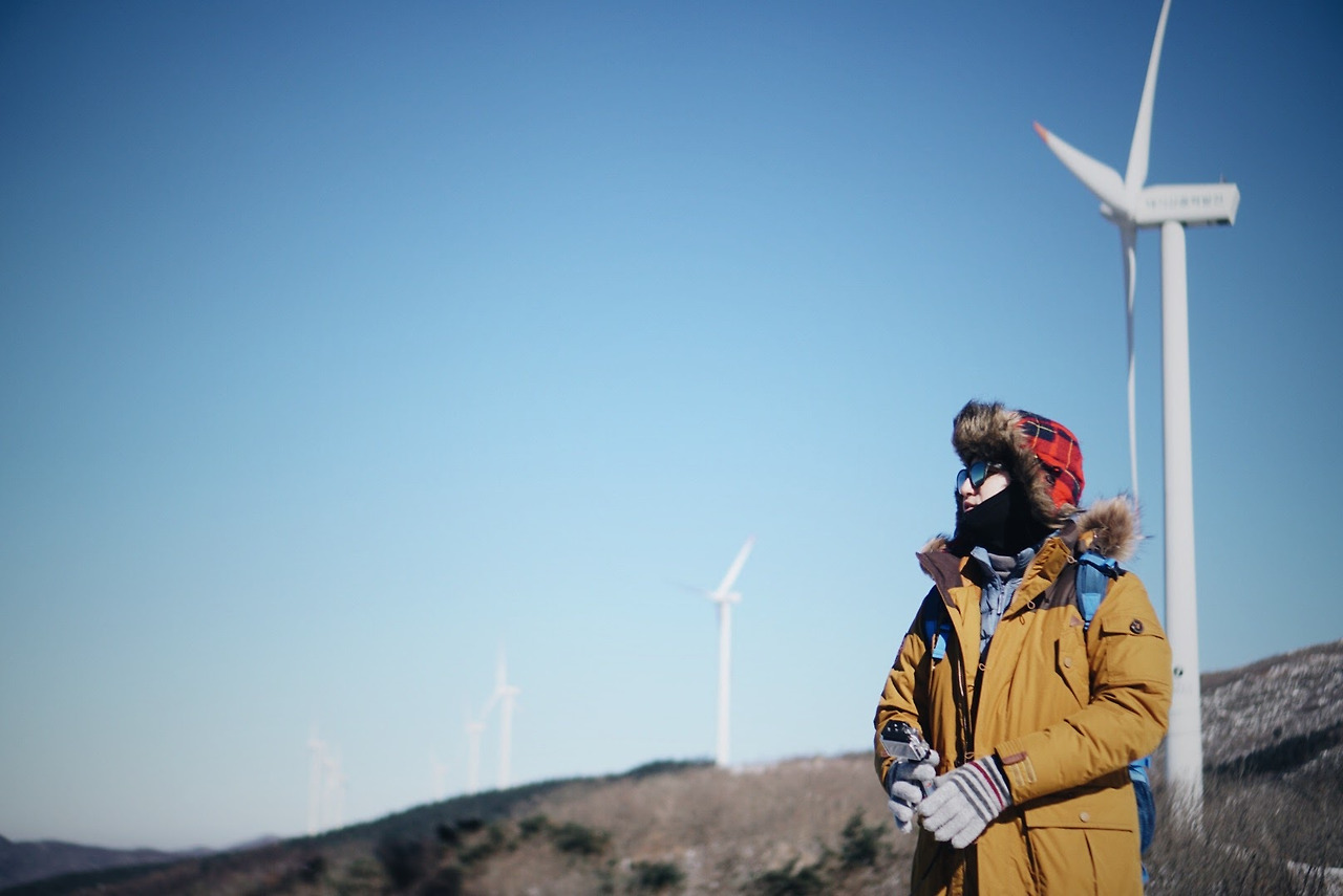 오늘 등산 아니 트래킹 코스를 따라가면 이렇게 풍력발전기를 옆에 두고 이동하게 된다. 발전기에 붙어있던 고드름이 떨어질 수 있으니 조심해야 한다.
