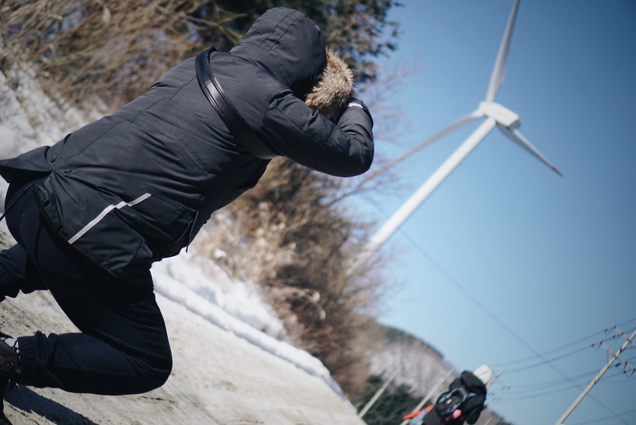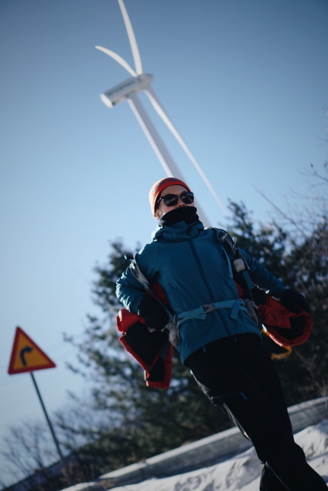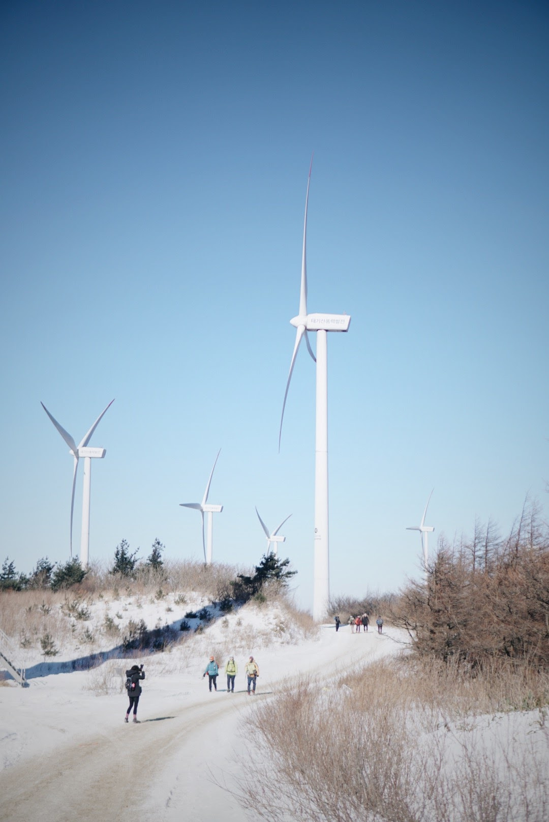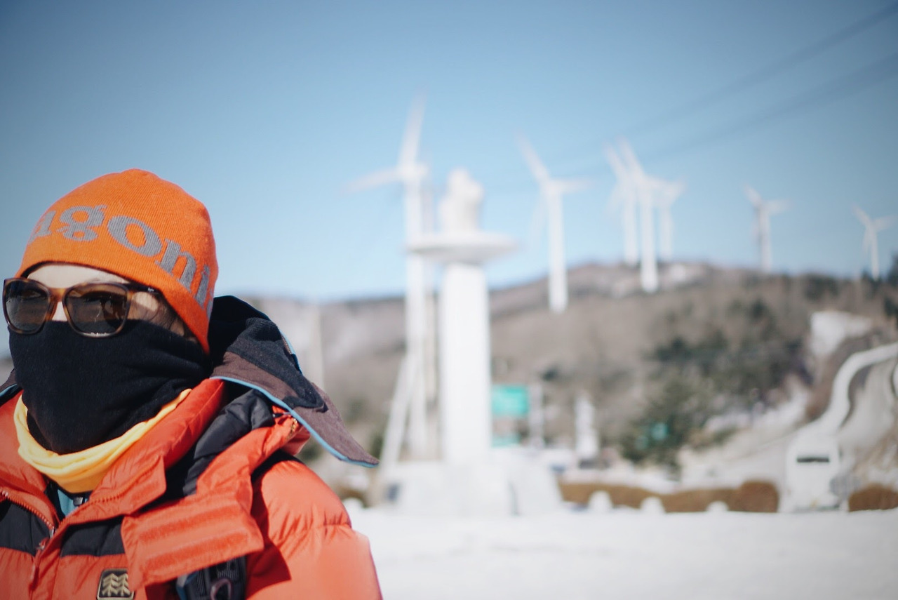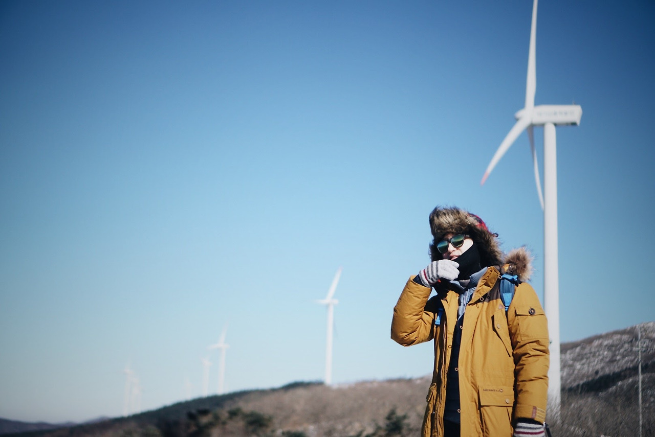 오늘 등산 아니 트래킹 코스를 따라가면 이렇게 풍력발전기를 옆에 두고 이동하게 된다. 발전기에 붙어있던 고드름이 떨어질 수 있으니 조심해야 한다.
