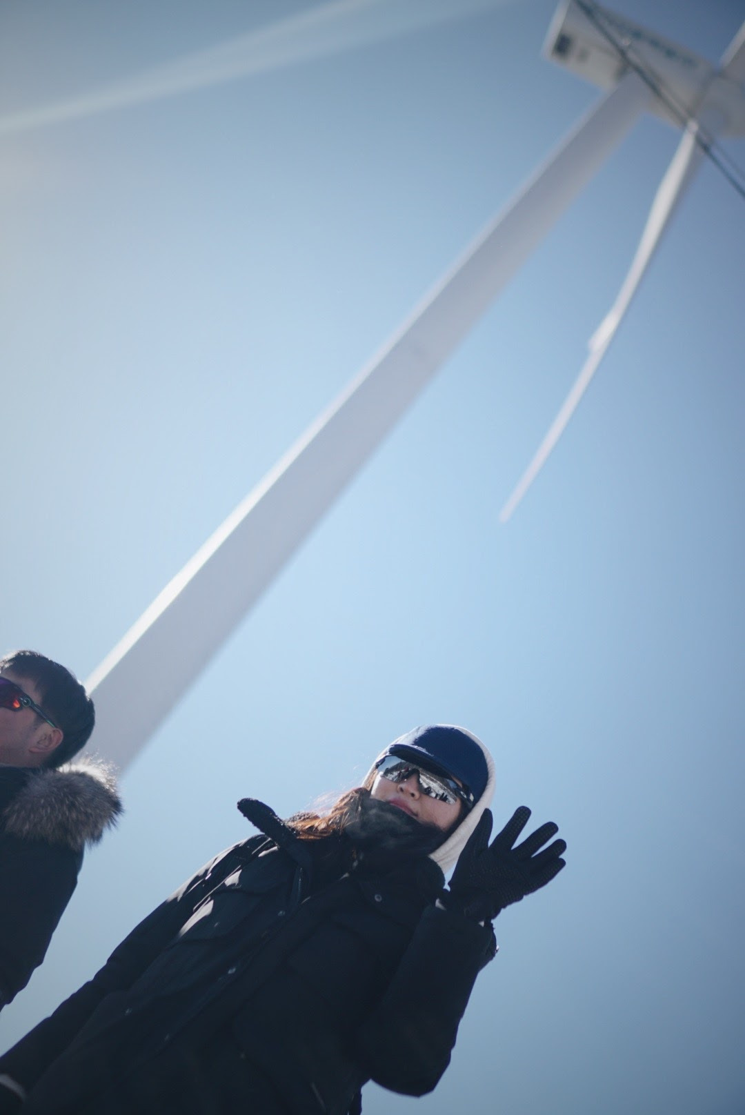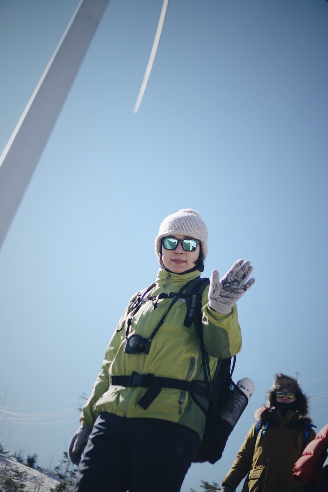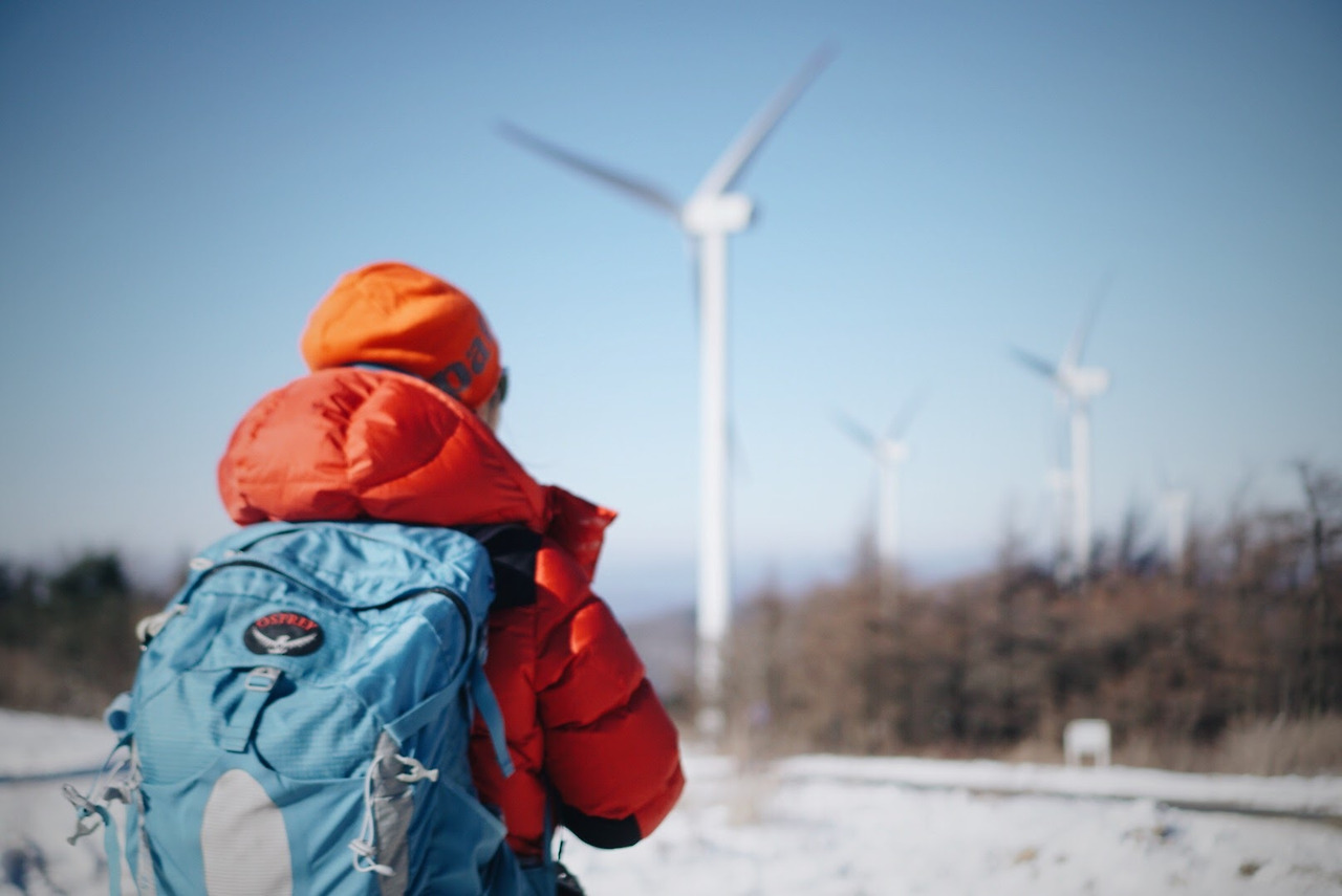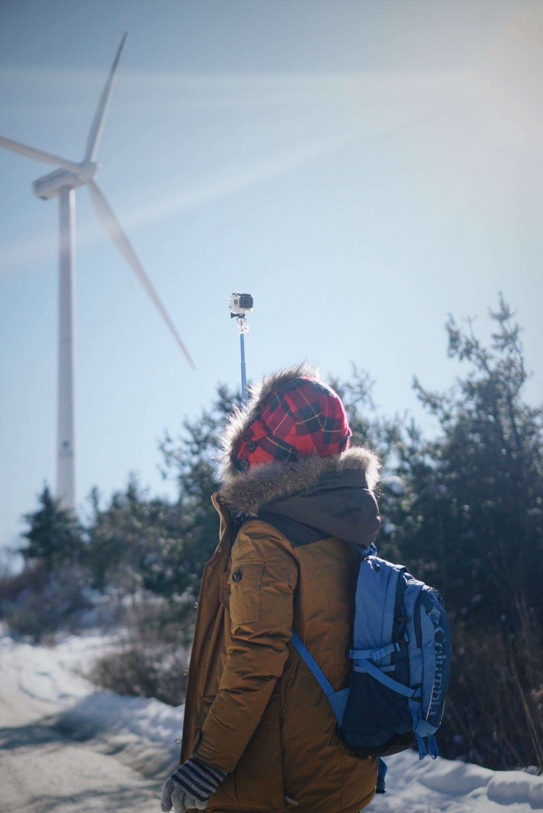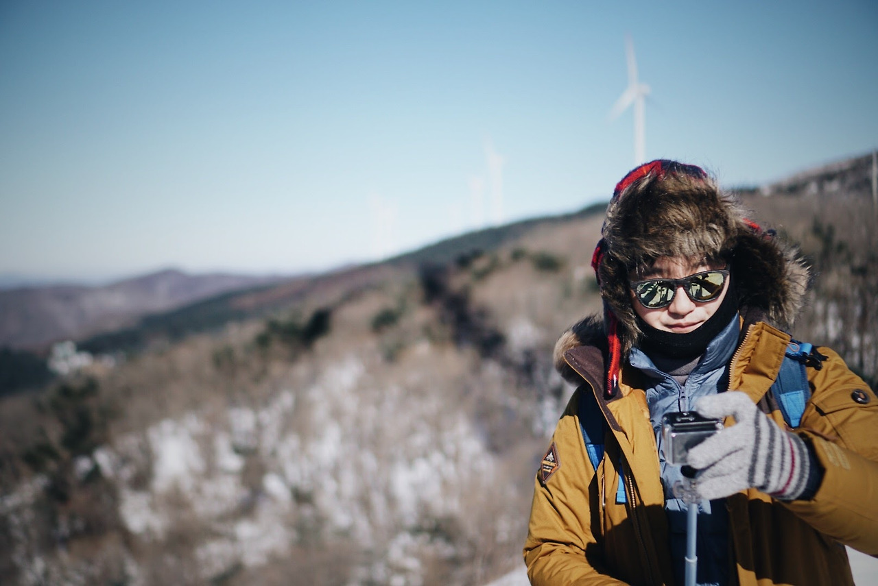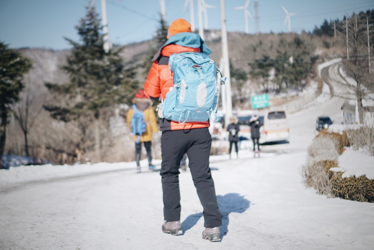 오늘 등산 아니 트래킹 코스를 따라가면 이렇게 풍력발전기를 옆에 두고 이동하게 된다. 발전기에 붙어있던 고드름이 떨어질 수 있으니 조심해야 한다.