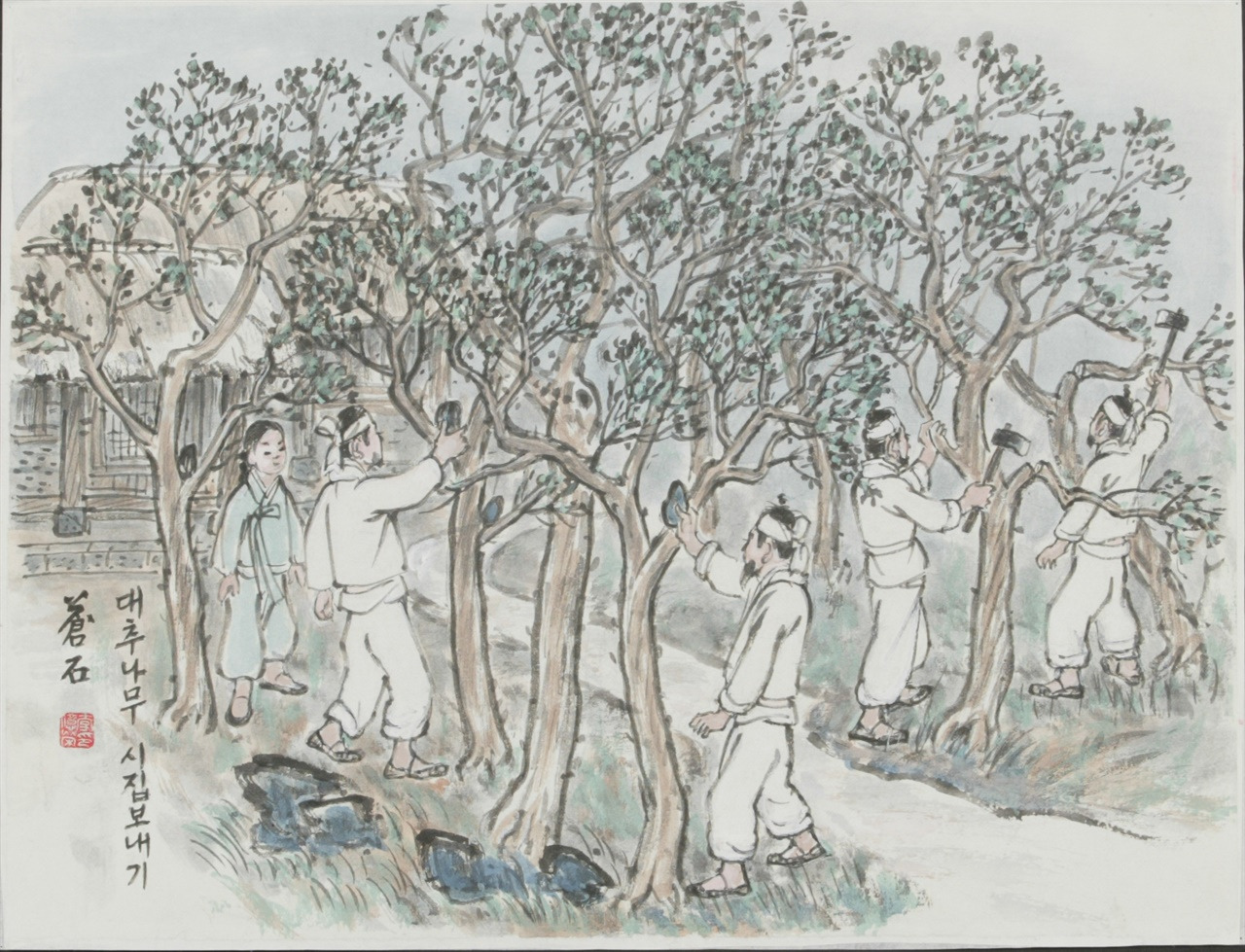 나무를 여성시(女性視)하여 나뭇가지와 나뭇가지 사이에 돌을 끼워 넣는 것으로 남녀 결합을 상징했다. 그로 인해 많은 수확을 기대했다. 그림 왼쪽을 살펴보면 남성들이 돌을 끼워 넣는 것을 볼 수 있고 오른쪽 남성은 도끼로 가지를 찍어내는 모습을 볼 수 있다. 보통 도끼를 들고 나무를 위협한 뒤 나뭇가지 사이에 돌을 꽂고, 도끼로 나무를 세 번 때린다. 이 행사는 보통 5월 5일 단오에 '대추나무'에만 하므로 이 날을 '대추나무시집보내기'라고 했다. 시기상 단오 무렵이면 대추가 열리기 시작한다. 지금 생각하면 상당히 의아한 행위지만 실제로 대추가 많이 열렸다고 전해진다.
