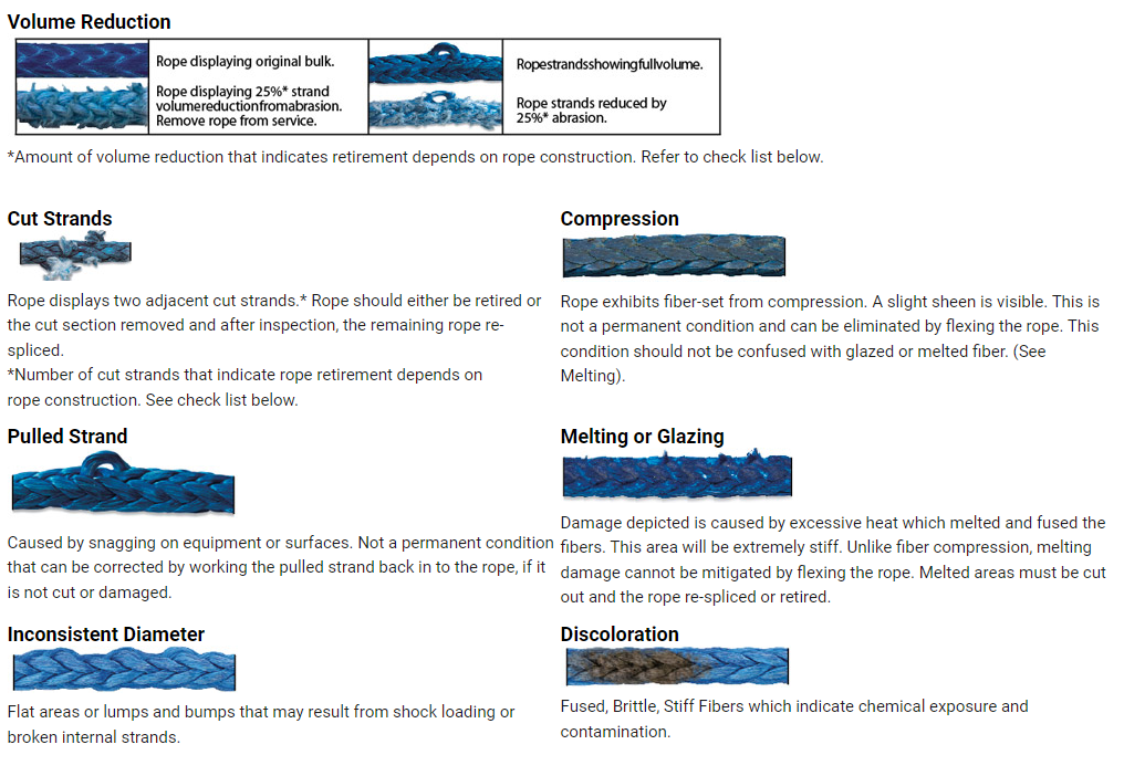 리깅 로프는 항상 사용 전에 점검해야 하고 아래 항목을 확인한다.