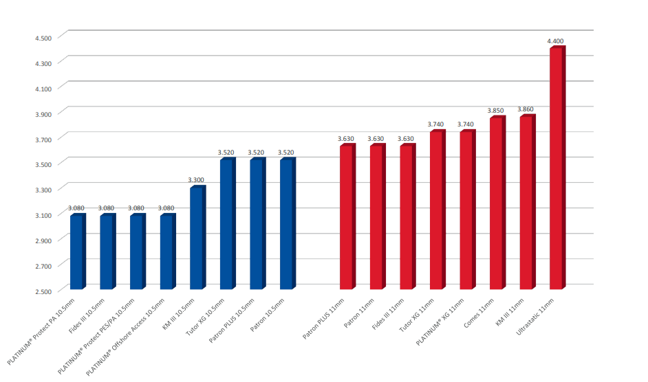 MBS의 단위는 데카뉴턴(daN)으로 읽으며 1 daN은 10N이다. 아래 그래프는 'teufelberger' 사에서 제작한 로프 직경(10.5mm, 11mm)과 제품에 따라 견딜 수 있는 최소 파괴 강도(Minimum beaking load)가 다르다.