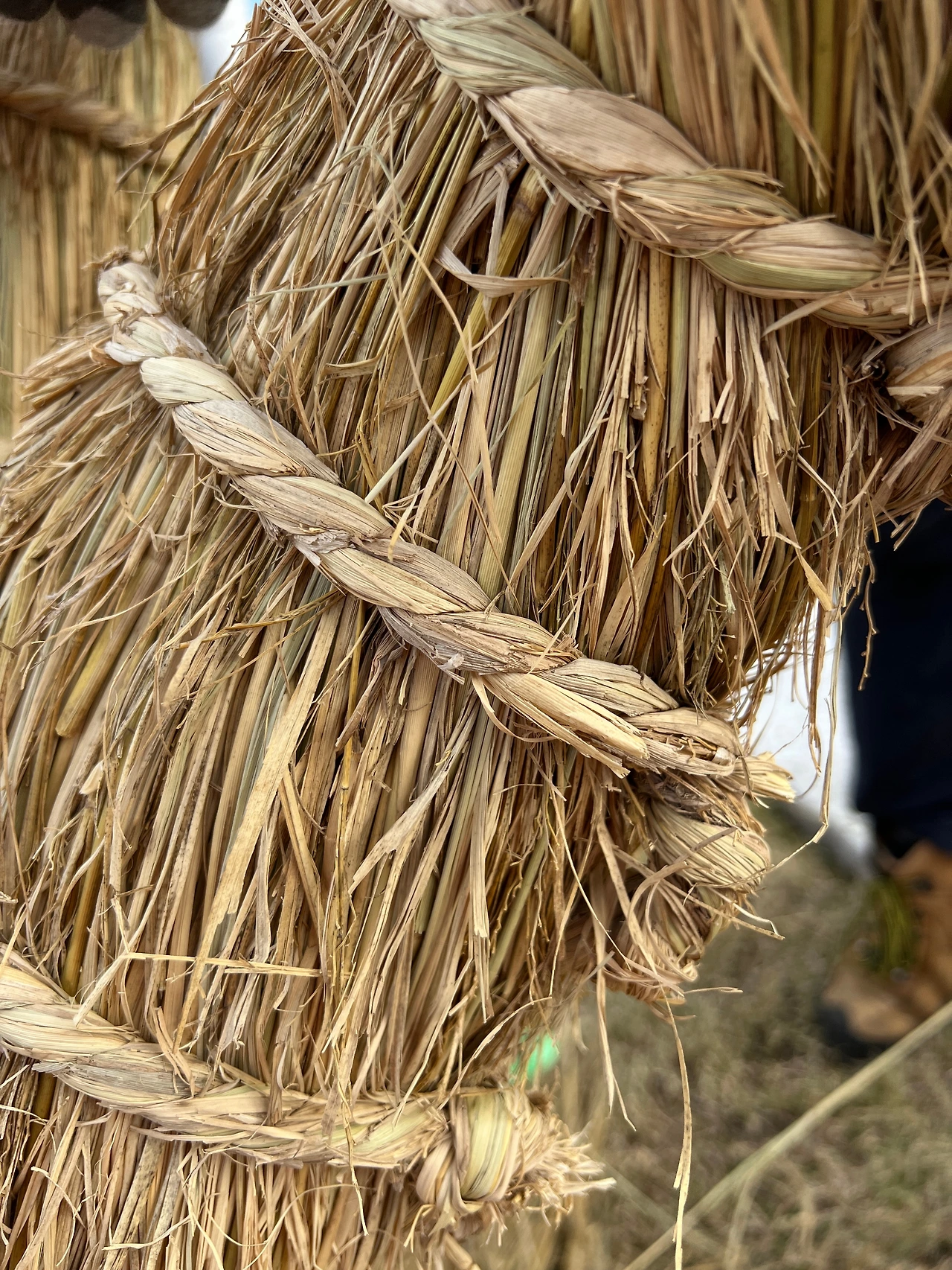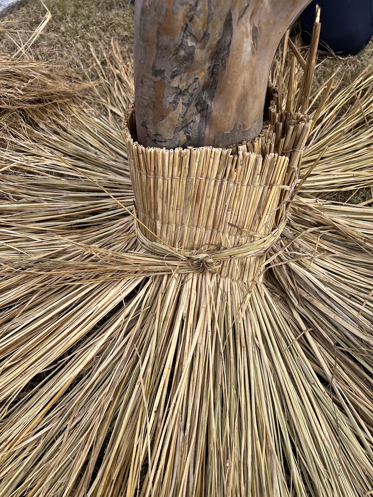 (2) 볏짚과 이엉을 이용해 줄기를 감싸준다. 감싸준 줄기가 고정되도록 재료를 이용해 '단추'를 만들어준다.