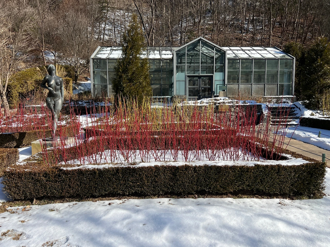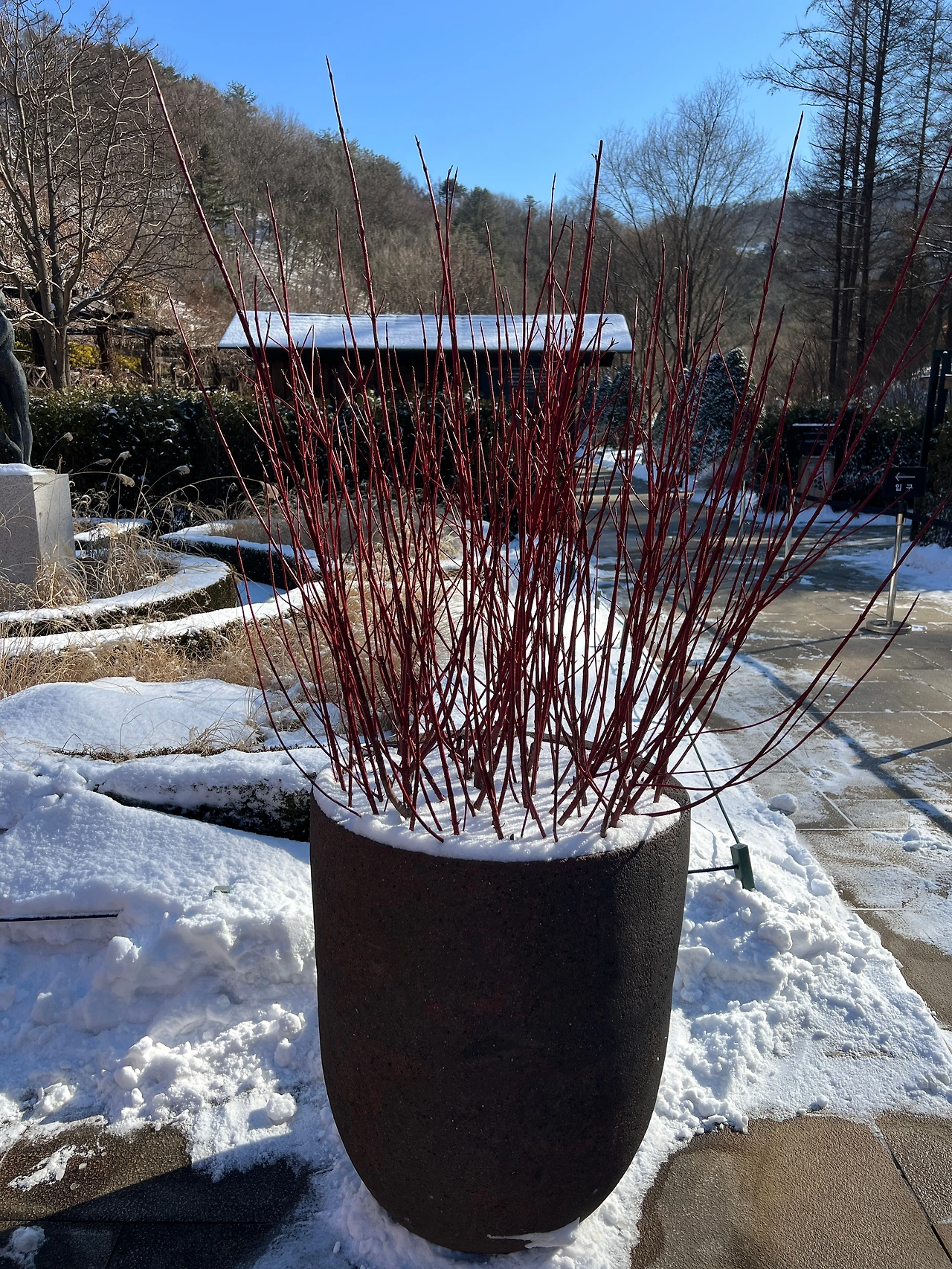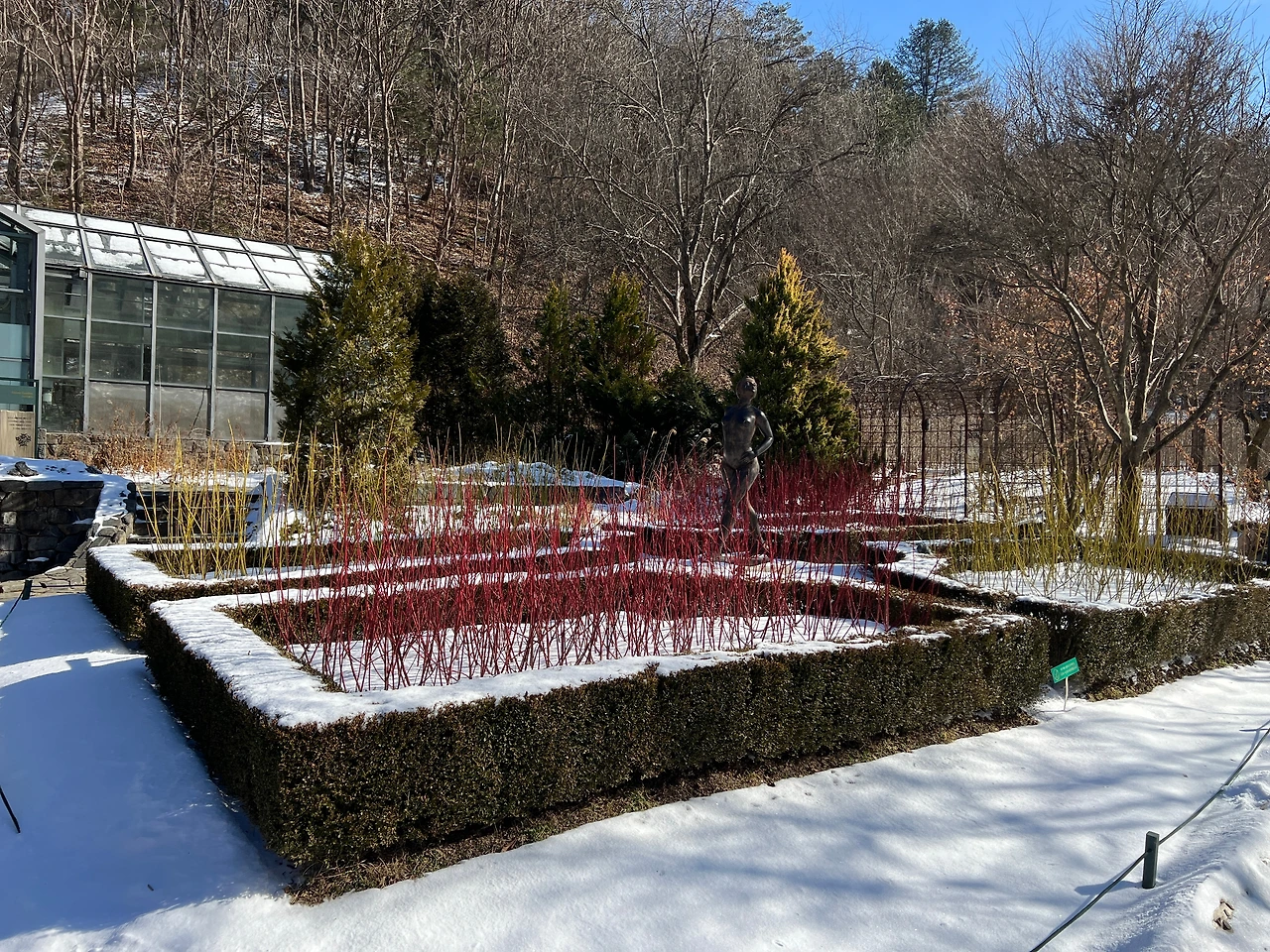 힘차게 혼자 걸어가며 주변 나무를 살펴보았다. 높게 솟은 일본 잎갈나무와 층층이 나눠져 있는 층층나무, 모든 잎이 떨어지고 줄기만 남은 등나무 그리고 강전정을 한 은행나무로 미로를 만들어놓은 장소 등 볼거리가 다양했다. 개인적으로 눈에 띈 장소는 유리온실 주변이었다. 그 주변엔 흰말채나무와 노란말채나무가 식재되었고 흰 눈이 소복이 쌓인 배경과 잘 어울렸다. 가만히 사진을 찍고 있는데 동료가 다가와 저 나무를 가리키며 무슨 나무냐고 물어봤다.