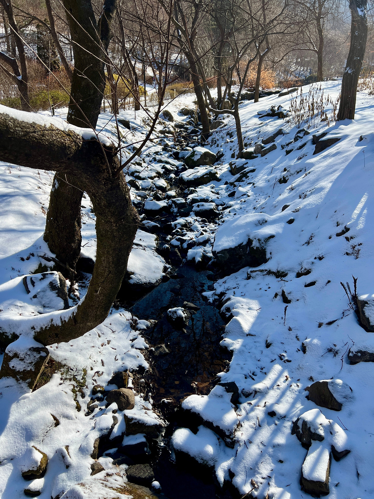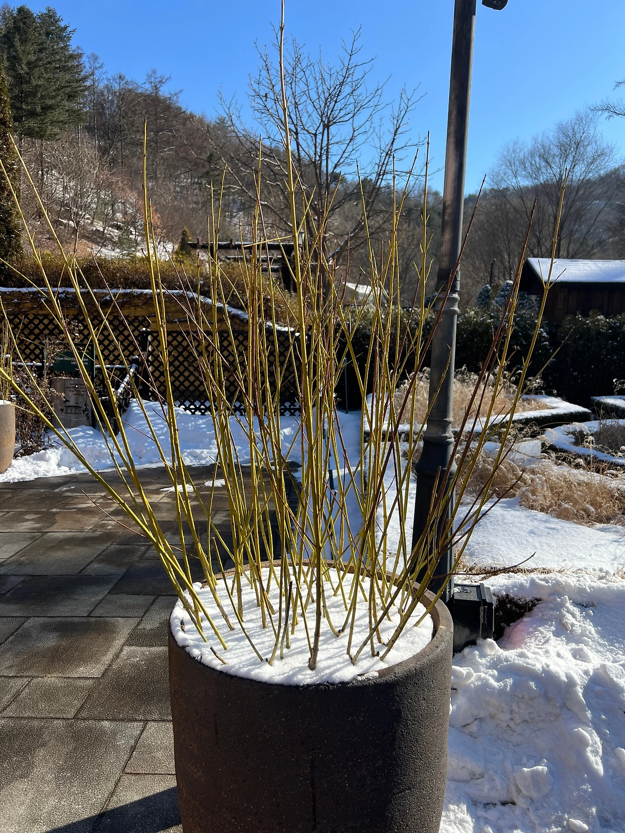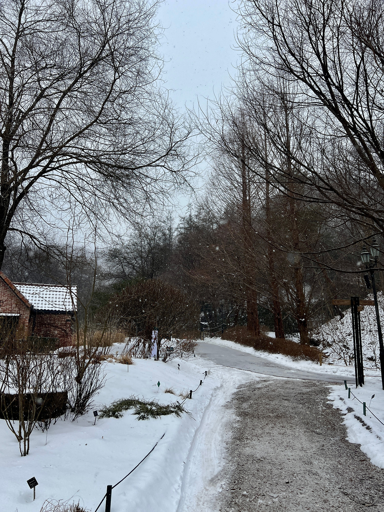 힘차게 혼자 걸어가며 주변 나무를 살펴보았다. 높게 솟은 일본 잎갈나무와 층층이 나눠져 있는 층층나무, 모든 잎이 떨어지고 줄기만 남은 등나무 그리고 강전정을 한 은행나무로 미로를 만들어놓은 장소 등 볼거리가 다양했다. 개인적으로 눈에 띈 장소는 유리온실 주변이었다. 그 주변엔 흰말채나무와 노란말채나무가 식재되었고 흰 눈이 소복이 쌓인 배경과 잘 어울렸다. 가만히 사진을 찍고 있는데 동료가 다가와 저 나무를 가리키며 무슨 나무냐고 물어봤다.