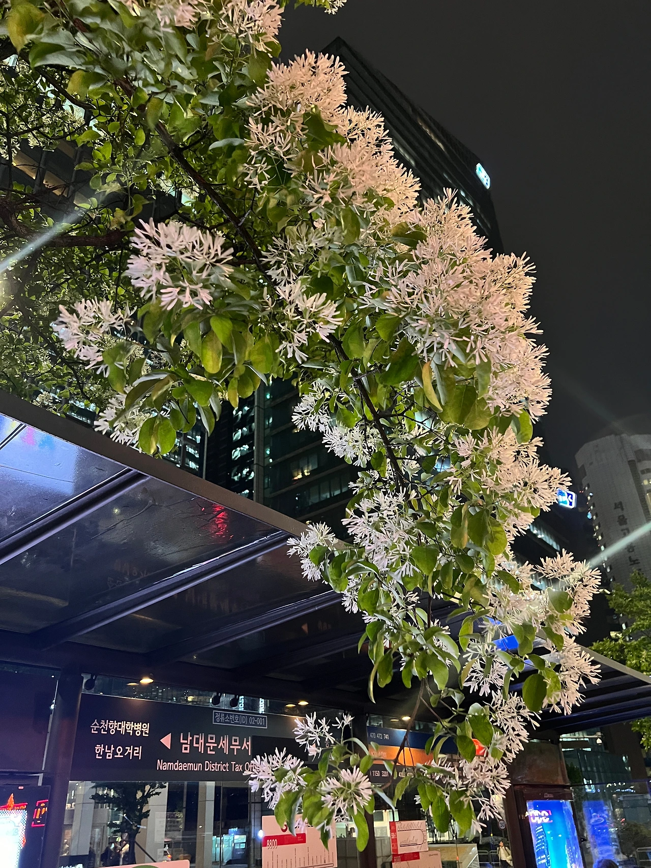 집으로 향하는 버스를 기다리는데 하얀 꽃이 만개한 이팝나무가 눈에 들어왔습니다. 가로등 불빛에 비친 꽃은 '벚꽃'이 가장 아름답다고 생각했었는데 이팝나무 꽃도 그 이상으로 아름답네요. 그만 멍 때리고 어서 집으로 가야겠습니다.