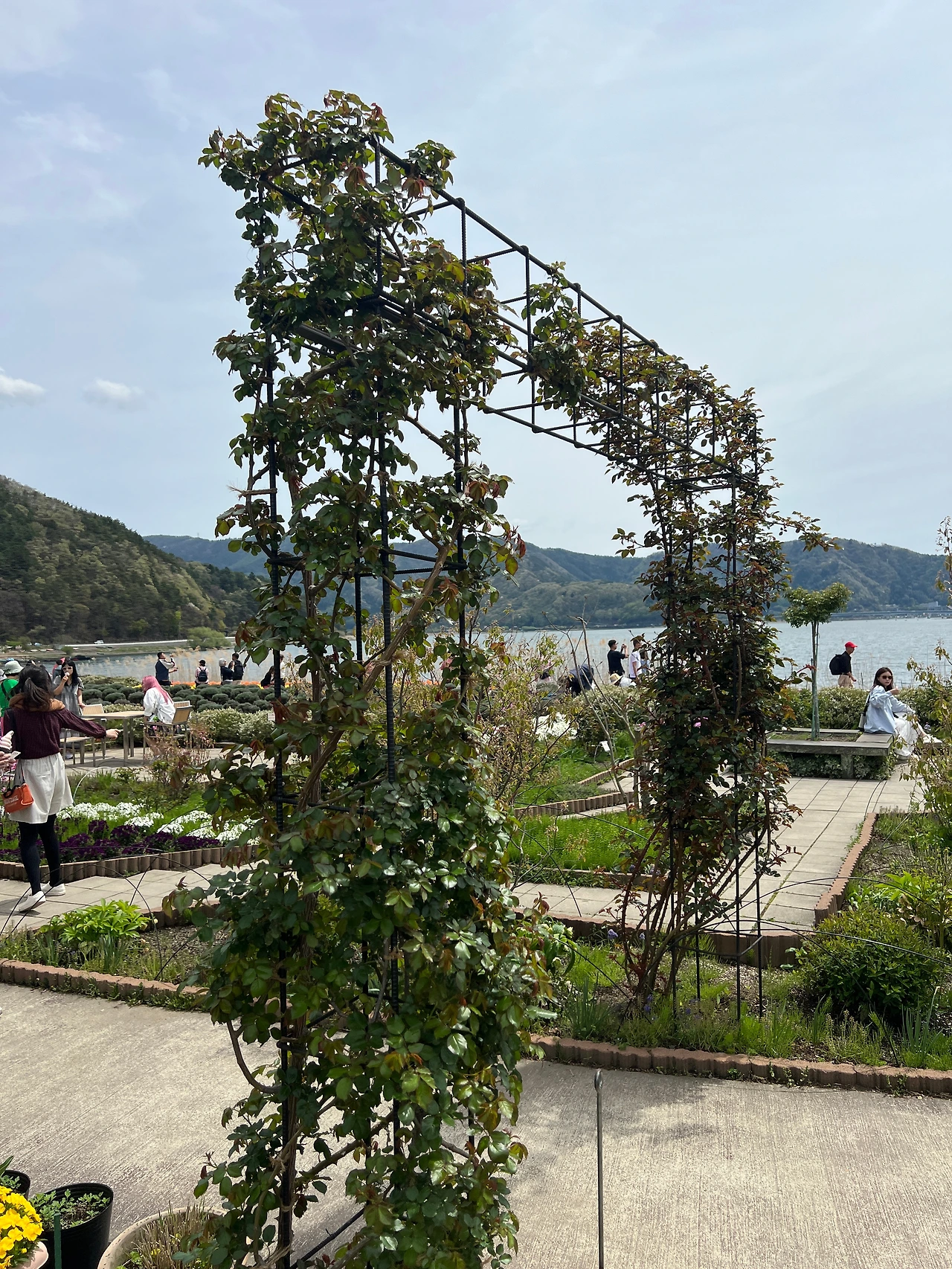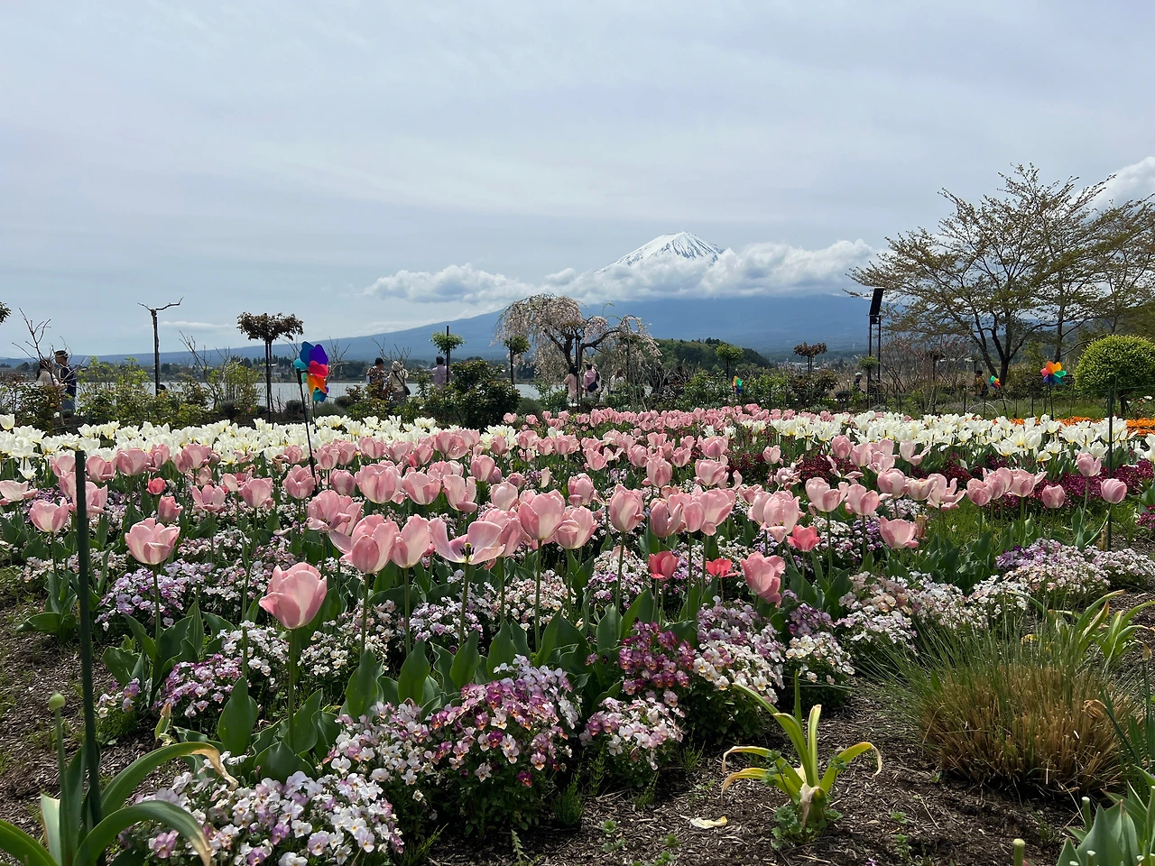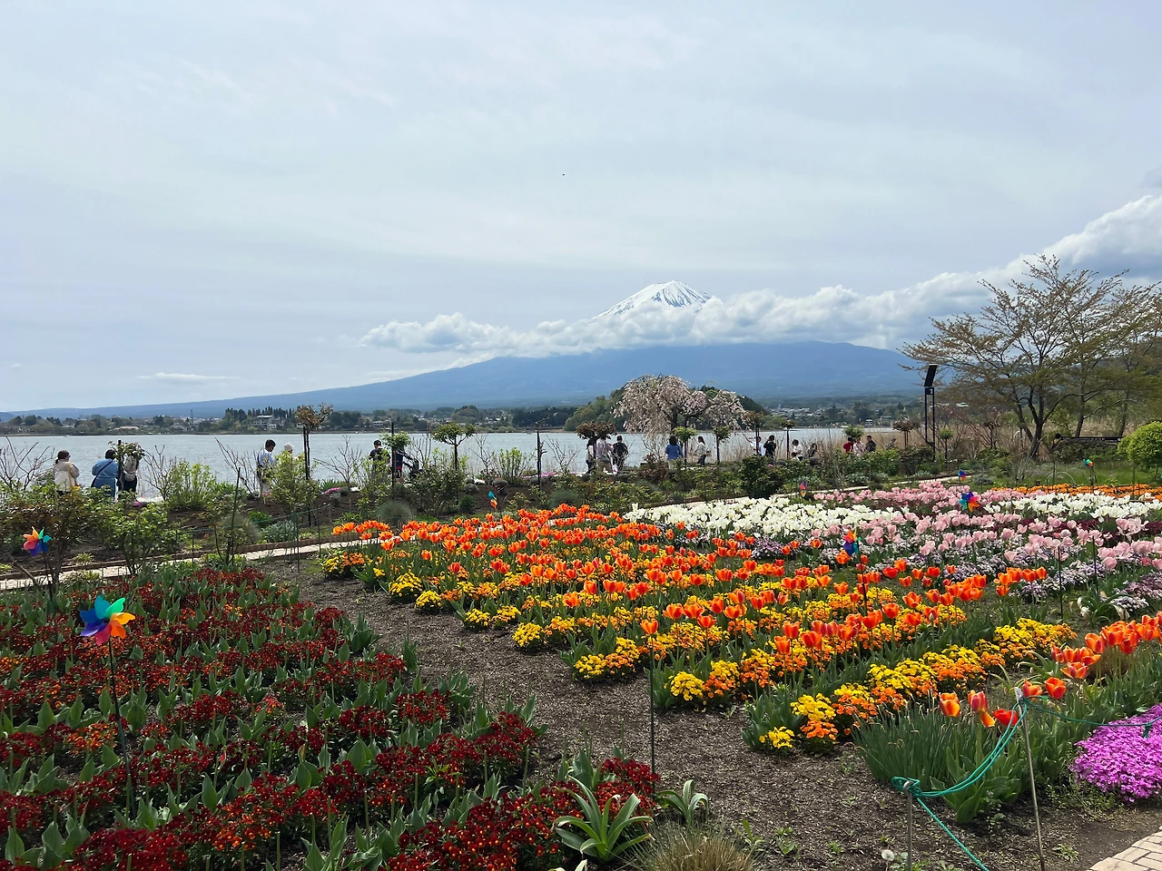 가와구치 호의 오이시 공원은 드넓은 호수 너머 후지산이 보이는 곳이다. 가와구치 호는 후지산 주변 5개의 호수 중 하나로 두 번째로 넓은 면적을 가졌다.