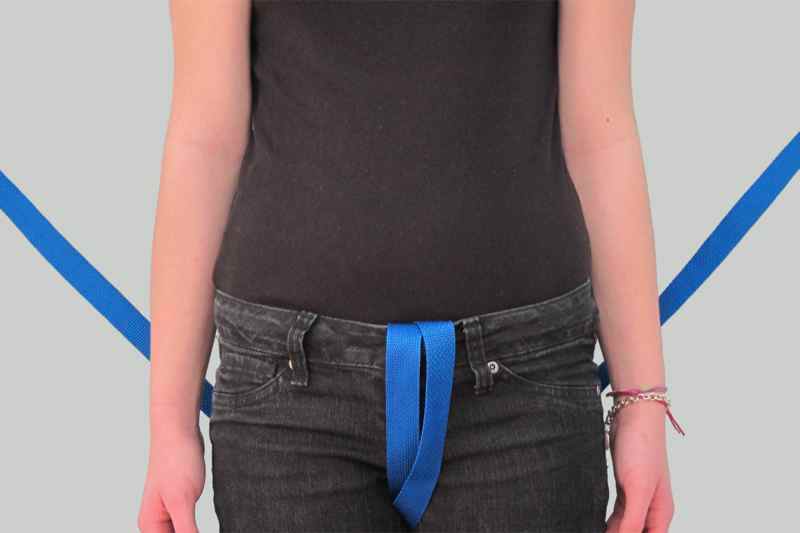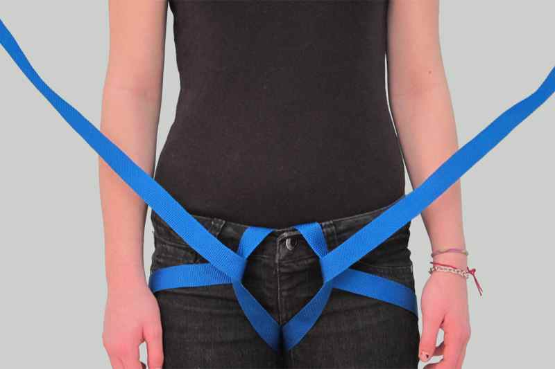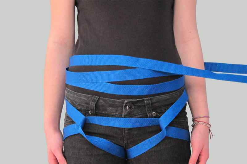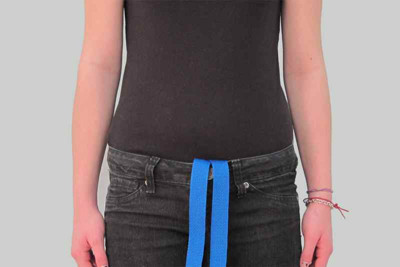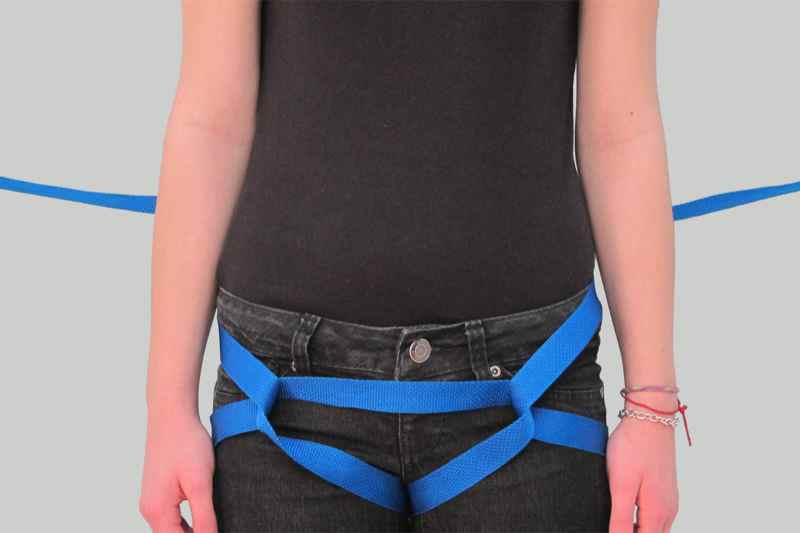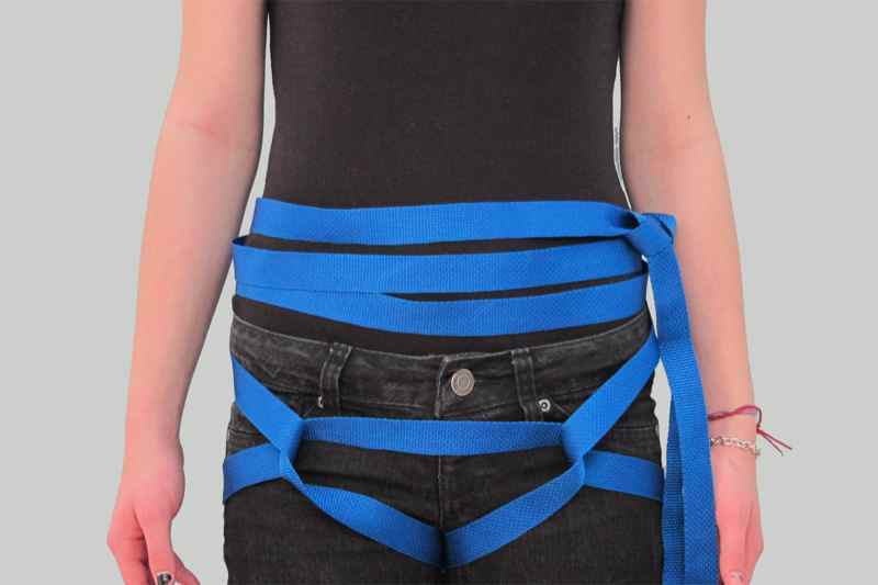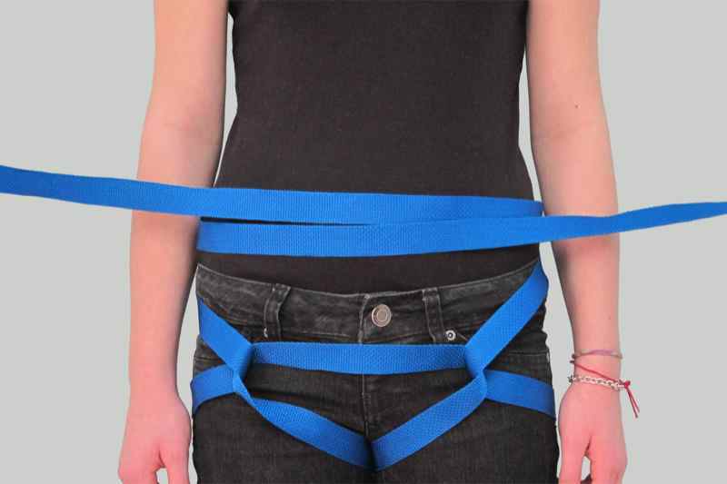 (1) 웨빙이나 로프를 같은 길이가 되게끔 절반 접어 중앙으로부터 15cm 루프를 만들어 바지의 허리 부근에 밀어 넣는다.