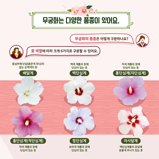 국화(國花) 지정을 떠나 무궁화는 우리 가슴속 한편에 깊은 뿌리를 내리고 있다. 고조선 이전 시대부터 무궁화는 ‘하늘나라꽃’으로 사랑받았고, 신라엔 근화향(槿花鄕 : 무궁화 나라)라고 불렸다. 이후 조선말 개항기를 거쳐 무궁화는 애국가의 한 소절로 불려진다.