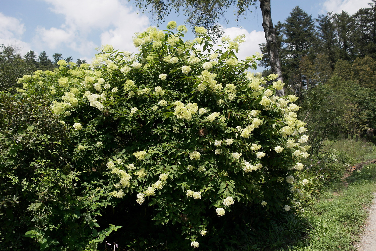 낙엽 지는 키 작은 나무로 높이는 2~3m로 자란다. 잎은 마주나거나 3장씩 돌려나기도 하며 끝은 뾰족하고 가장자리에 톱니가 있다. 꽃은 7~8월에 가지 끝에서 8~30cm 정도의 원추꽃차례에 흰 장식화와 양성화가 모여 달린다. 꽃차례에 장식화만 피우는 나무는 '큰나무수국(f.grandiflora)'이며 조경용으로 식재된다.